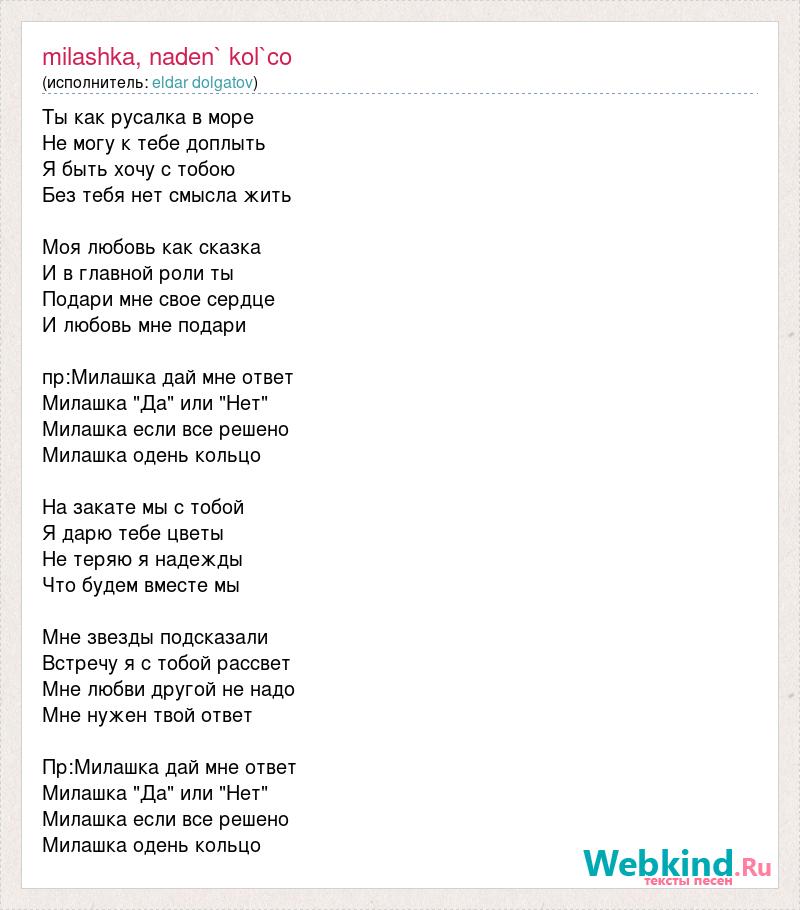Ты как русалка в море Не могу к тебе доплыть Я быть хочу с тобою Без тебя нет смысла жить Моя любовь как сказка И в главной роли ты Подари мне свое сердце И любовь мне подари пр:Милашка дай мне ответ Милашка "Да" или "Нет" Милашка если все решено Милашка одень кольцо На закате мы с тобой Я дарю тебе цветы Не теряю я надежды Что будем вместе мы Мне звезды подсказали Встречу я с тобой рассвет Мне любви другой не надо Мне нужен твой ответ Пр:Милашка дай мне ответ Милашка "Да" или "Нет" Милашка если все решено Милашка одень кольцо