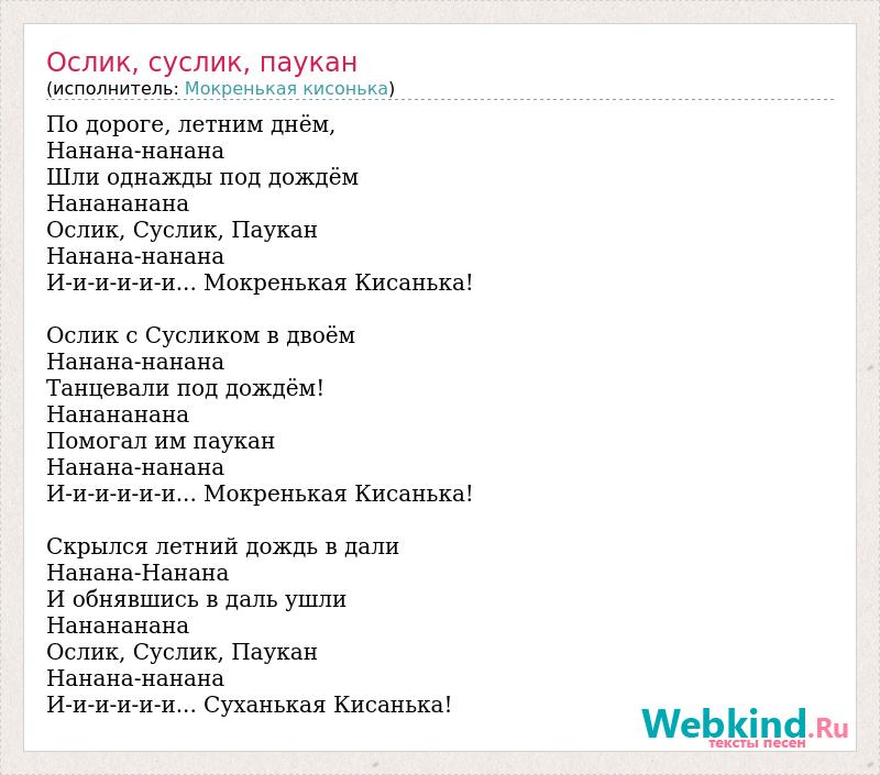 По дороге, летним днём, Нанана-нанана Шли однажды под дождём Нанананана Ослик, Суслик, Паукан Нанана-нанана И-и-и-и-и-и... Мокренькая Кисанька! Ослик с Сусликом в двоём Нанана-нанана Танцевали под дождём! Нанананана Помогал им паукан Нанана-нанана И-и-и-и-и-и... Мокренькая Кисанька! Скрылся летний дождь в дали Нанана-Нанана И обнявшись в даль ушли Нанананана Ослик, Суслик, Паукан Нанана-нанана И-и-и-и-и-и... Суханькая Кисанька!