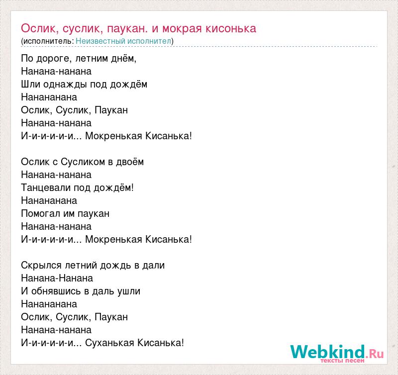 По дороге, летним днём, Нанана-нанана Шли однажды под дождём Нанананана Ослик, Суслик, Паукан Нанана-нанана И-и-и-и-и-и... Мокренькая Кисанька! Ослик с Сусликом в двоём Нанана-нанана Танцевали под дождём! Нанананана Помогал им паукан Нанана-нанана И-и-и-и-и-и... Мокренькая Кисанька! Скрылся летний дождь в дали Нанана-Нанана И обнявшись в даль ушли Нанананана Ослик, Суслик, Паукан Нанана-нанана И-и-и-и-и-и... Суханькая Кисанька!