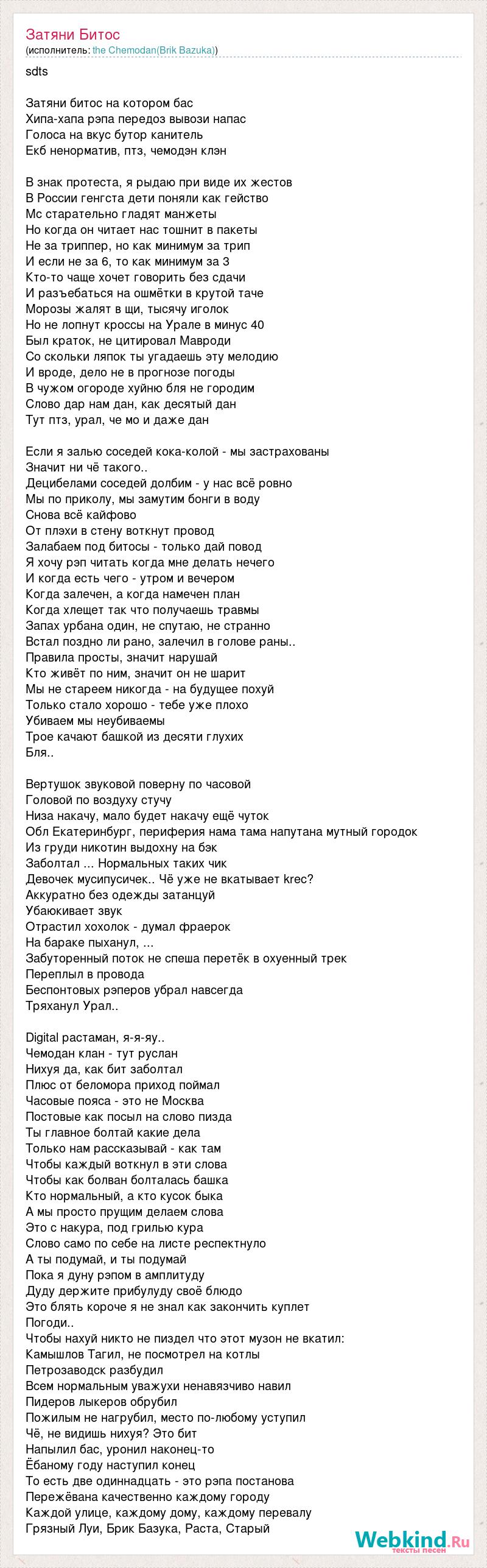 sdts Затяни битос на котором бас Хипа-хапа рэпа передоз вывози напас Голоса на вкус бутор канитель Екб ненорматив, птз, чемодэн клэн В знак протеста, я рыдаю при виде их жестов В России генгста дети поняли как гейство Мс старательно гладят манжеты Но когда он читает нас тошнит в пакеты Не за триппер, но как минимум за трип И если не за 6, то как минимум за 3 Кто-то чаще хочет говорить без сдачи И разъебаться на ошмётки в крутой таче Морозы жалят в щи, тысячу иголок Но не лопнут кроссы на Урале в минус 40 Был краток, не цитировал Мавроди Со скольки ляпок ты угадаешь эту мелодию И вроде, дело не в прогнозе погоды В чужом огороде хуйню бля не городим Слово дар нам дан, как десятый дан Тут птз, урал, че мо и даже дан Если я залью соседей кока-колой - мы застрахованы Значит ни чё такого.. Децибелами соседей долбим - у нас всё ровно Мы по приколу, мы замутим бонги в воду Снова всё кайфово От плэхи в стену воткнут провод Залабаем под битосы - только дай повод Я хочу рэп читать когда мне делать нечего И когда есть чего - утром и вечером Когда залечен, а когда намечен план Когда хлещет так что получаешь травмы Запах урбана один, не спутаю, не странно Встал поздно ли рано, залечил в голове раны.. Правила просты, значит нарушай Кто живёт по ним, значит он не шарит Мы не стареем никогда - на будущее похуй Только стало хорошо - тебе уже плохо Убиваем мы неубиваемы Трое качают башкой из десяти глухих Бля.. Вертушок звуковой поверну по часовой Головой по воздуху стучу Низа накачу, мало будет накачу ещё чуток Обл Екатеринбург, периферия нама тама напутана мутный городок Из груди никотин выдохну на бэк Заболтал ... Нормальных таких чик Девочек мусипусичек.. Чё уже не вкатывает krec? Аккуратно без одежды затанцуй Убаюкивает звук Отрастил хохолок - думал фраерок На бараке пыханул, ... Забуторенный поток не спеша перетёк в охуенный трек Переплыл в провода Беспонтовых рэперов убрал навсегда Тряханул Урал.. Digital растаман, я-я-яу.. Чемодан клан - тут руслан Нихуя да, как бит заболтал Плюс от беломора приход поймал Часовые пояса - это не Москва Постовые как посыл на слово пизда Ты главное болтай какие дела Только нам рассказывай - как там Чтобы каждый воткнул в эти слова Чтобы как болван болталась башка Кто нормальный, а кто кусок быка А мы просто прущим делаем слова Это с накура, под грилью кура Слово само по себе на листе респектнуло А ты подумай, и ты подумай Пока я дуну рэпом в амплитуду Дуду держите прибулуду своё блюдо Это блять короче я не знал как закончить куплет Погоди.. Чтобы нахуй никто не пиздел что этот музон не вкатил: Камышлов Тагил, не посмотрел на котлы Петрозаводск разбудил Всем нормальным уважухи ненавязчиво навил Пидеров лыкеров обрубил Пожилым не нагрубил, место по-любому уступил Чё, не видишь нихуя? Это бит Напылил бас, уронил наконец-то Ёбаному году наступил конец То есть две одиннадцать - это рэпа постанова Пережёвана качественно каждому городу Каждой улице, каждому дому, каждому перевалу Грязный Луи, Брик Базука, Раста, Старый