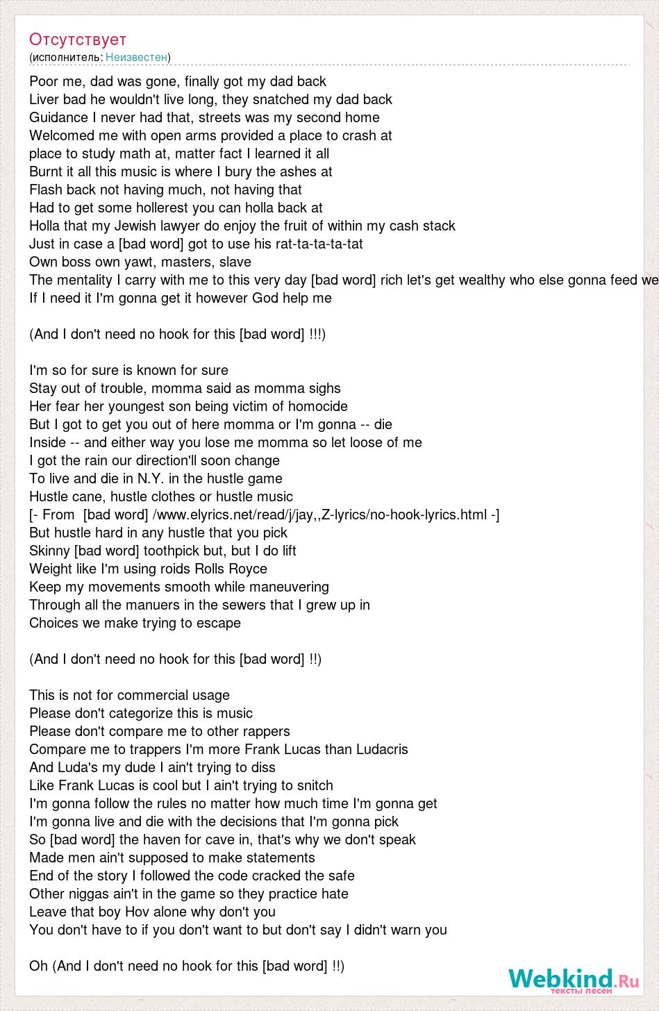 Poor me, dad was gone, finally got my dad back Liver bad he wouldn't live long, they snatched my dad back Guidance I never had that, streets was my second home Welcomed me with open arms provided a place to crash at place to study math at, matter fact I learned it all Burnt it all this music is where I bury the ashes at Flash back not having much, not having that Had to get some hollerest you can holla back at Holla that my Jewish lawyer do enjoy the fruit of within my cash stack Just in case a [bad word] got to use his rat-ta-ta-ta-tat Own boss own yawt, masters, slave The mentality I carry with me to this very day [bad word] rich let's get wealthy who else gonna feed we If I need it I'm gonna get it however God help me (And I don't need no hook for this [bad word] !!!) I'm so for sure is known for sure Stay out of trouble, momma said as momma sighs Her fear her youngest son being victim of homocide But I got to get you out of here momma or I'm gonna -- die Inside -- and either way you lose me momma so let loose of me I got the rain our direction'll soon change To live and die in N.Y. in the hustle game Hustle cane, hustle clothes or hustle music [- From [bad word] /www.elyrics.net/read/j/jay,,Z-lyrics/no-hook-lyrics.html -] But hustle hard in any hustle that you pick Skinny [bad word] toothpick but, but I do lift Weight like I'm using roids Rolls Royce Keep my movements smooth while maneuvering Through all the manuers in the sewers that I grew up in Choices we make trying to escape (And I don't need no hook for this [bad word] !!) This is not for commercial usage Please don't categorize this is music Please don't compare me to other rappers Compare me to trappers I'm more Frank Lucas than Ludacris And Luda's my dude I ain't trying to diss Like Frank Lucas is cool but I ain't trying to snitch I'm gonna follow the rules no matter how much time I'm gonna get I'm gonna live and die with the decisions that I'm gonna pick So [bad word] the haven for cave in, that's why we don't speak Made men ain't supposed to make statements End of the story I followed the code cracked the safe Other niggas ain't in the game so they practice hate Leave that boy Hov alone why don't you You don't have to if you don't want to but don't say I didn't warn you Oh (And I don't need no hook for this [bad word] !!)