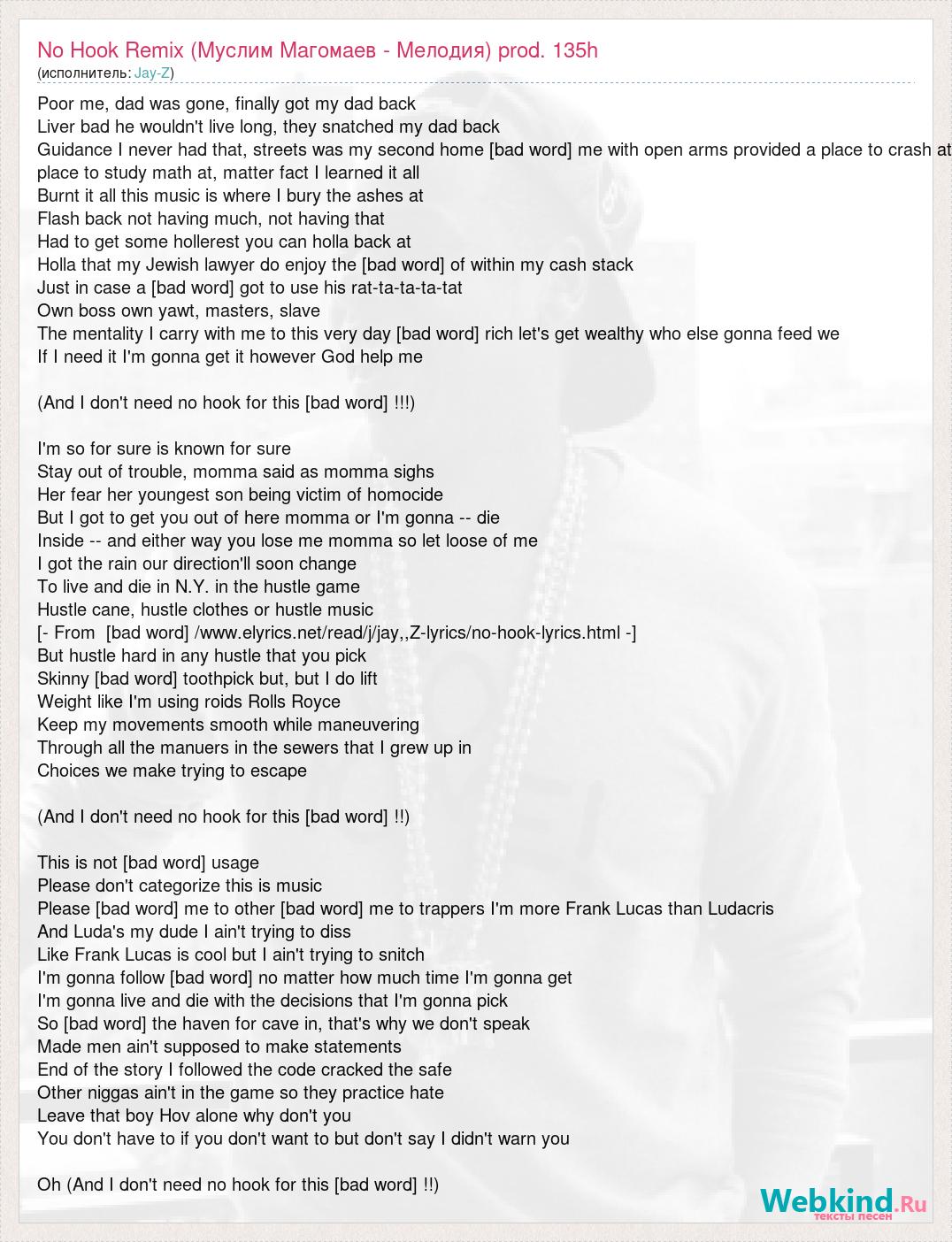 Poor me, dad was gone, finally got my dad back Liver bad he wouldn't live long, they snatched my dad back Guidance I never had that, streets was my second home [bad word] me with open arms provided a place to crash at place to study math at, matter fact I learned it all Burnt it all this music is where I bury the ashes at Flash back not having much, not having that Had to get some hollerest you can holla back at Holla that my Jewish lawyer do enjoy the [bad word] of within my cash stack Just in case a [bad word] got to use his rat-ta-ta-ta-tat Own boss own yawt, masters, slave The mentality I carry with me to this very day [bad word] rich let's get wealthy who else gonna feed we If I need it I'm gonna get it however God help me (And I don't need no hook for this [bad word] !!!) I'm so for sure is known for sure Stay out of trouble, momma said as momma sighs Her fear her youngest son being victim of homocide But I got to get you out of here momma or I'm gonna -- die Inside -- and either way you lose me momma so let loose of me I got the rain our direction'll soon change To live and die in N.Y. in the hustle game Hustle cane, hustle clothes or hustle music [- From [bad word] /www.elyrics.net/read/j/jay,,Z-lyrics/no-hook-lyrics.html -] But hustle hard in any hustle that you pick Skinny [bad word] toothpick but, but I do lift Weight like I'm using roids Rolls Royce Keep my movements smooth while maneuvering Through all the manuers in the sewers that I grew up in Choices we make trying to escape (And I don't need no hook for this [bad word] !!) This is not [bad word] usage Please don't categorize this is music Please [bad word] me to other [bad word] me to trappers I'm more Frank Lucas than Ludacris And Luda's my dude I ain't trying to diss Like Frank Lucas is cool but I ain't trying to snitch I'm gonna follow [bad word] no matter how much time I'm gonna get I'm gonna live and die with the decisions that I'm gonna pick So [bad word] the haven for cave in, that's why we don't speak Made men ain't supposed to make statements End of the story I followed the code cracked the safe Other niggas ain't in the game so they practice hate Leave that boy Hov alone why don't you You don't have to if you don't want to but don't say I didn't warn you Oh (And I don't need no hook for this [bad word] !!)