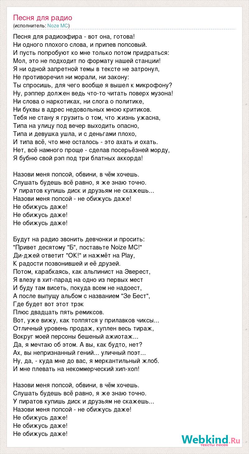 Песня для радиоэфира - вот она, готова! Ни одного плохого слова, и припев попсовый. И пусть попробуют ко мне только потом придраться: Мол, это не подходит по формату нашей станции! Я ни одной запретной темы в тексте не затронул, Не противоречил ни морали, ни закону: Ты спросишь, для чего вообще я вышел к микрофону? Ну, рэппер должен ведь что-то читать поверх музона! Ни слова о наркотиках, ни слога о политике, Ни буквы в адрес недовольных мною критиков. Тебя не стану я грузить о том, что жизнь ужасна, Типа на улицу под вечер выходить опасно, Типа и девушка ушла, и с деньгами плохо, И типа всё, что мне осталось - это ахать и охать. Нет, всё намного проще - сделав посерьёзней морду, Я бубню свой рэп под три блатных аккорда! Назови меня попсой, обвини, в чём хочешь. Слушать будешь всё равно, я же знаю точно. У пиратов купишь диск и друзьям не скажешь... Назови меня попсой - не обижусь даже! Не обижусь даже! Не обижусь даже! Не обижусь даже! Будут на радио звонить девчонки и просить: "Привет десятому "Б", поставьте Noize MC!" Ди-джей ответит "ОК!" и нажмёт на Play, К радости позвонившей и её друзей. Потом, карабкаясь, как альпинист на Эверест, Я влезу в хит-парад на одно из первых мест И буду там висеть, покуда всем не надоест, А после выпущу альбом с названием "Зе Бест", Где будет вот этот трэк Плюс двадцать пять ремиксов. Вот, уже вижу, как толпятся у прилавков чиксы... Отличный уровень продаж, куплен весь тираж, Вокруг моей персоны бешеный ажиотаж... Да, я мечтаю об этом. А вы, как будто, нет? Ах, вы непризнанный гений... уличный поэт... Ну, да, - куда мне до вас, я меркантильный жлоб. И мне плевать на некоммерческий хип-хоп! Назови меня попсой, обвини, в чём хочешь. Слушать будешь всё равно, я же знаю точно. У пиратов купишь диск и друзьям не скажешь... Назови меня попсой - не обижусь даже! Не обижусь даже! Не обижусь даже! Не обижусь даже!