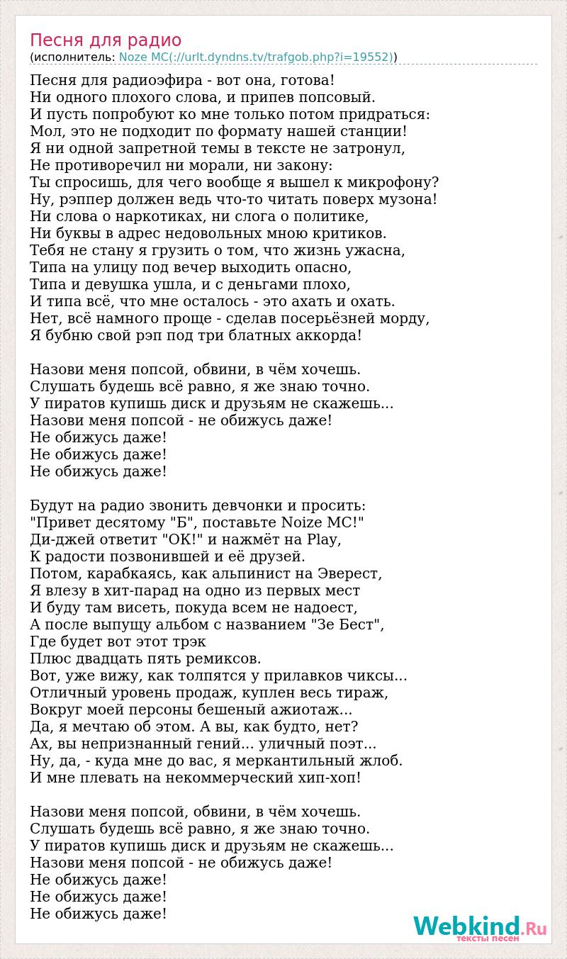 Песня для радиоэфира - вот она, готова! Ни одного плохого слова, и припев попсовый. И пусть попробуют ко мне только потом придраться: Мол, это не подходит по формату нашей станции! Я ни одной запретной темы в тексте не затронул, Не противоречил ни морали, ни закону: Ты спросишь, для чего вообще я вышел к микрофону? Ну, рэппер должен ведь что-то читать поверх музона! Ни слова о наркотиках, ни слога о политике, Ни буквы в адрес недовольных мною критиков. Тебя не стану я грузить о том, что жизнь ужасна, Типа на улицу под вечер выходить опасно, Типа и девушка ушла, и с деньгами плохо, И типа всё, что мне осталось - это ахать и охать. Нет, всё намного проще - сделав посерьёзней морду, Я бубню свой рэп под три блатных аккорда! Назови меня попсой, обвини, в чём хочешь. Слушать будешь всё равно, я же знаю точно. У пиратов купишь диск и друзьям не скажешь... Назови меня попсой - не обижусь даже! Не обижусь даже! Не обижусь даже! Не обижусь даже! Будут на радио звонить девчонки и просить: "Привет десятому "Б", поставьте Noize MC!" Ди-джей ответит "ОК!" и нажмёт на Play, К радости позвонившей и её друзей. Потом, карабкаясь, как альпинист на Эверест, Я влезу в хит-парад на одно из первых мест И буду там висеть, покуда всем не надоест, А после выпущу альбом с названием "Зе Бест", Где будет вот этот трэк Плюс двадцать пять ремиксов. Вот, уже вижу, как толпятся у прилавков чиксы... Отличный уровень продаж, куплен весь тираж, Вокруг моей персоны бешеный ажиотаж... Да, я мечтаю об этом. А вы, как будто, нет? Ах, вы непризнанный гений... уличный поэт... Ну, да, - куда мне до вас, я меркантильный жлоб. И мне плевать на некоммерческий хип-хоп! Назови меня попсой, обвини, в чём хочешь. Слушать будешь всё равно, я же знаю точно. У пиратов купишь диск и друзьям не скажешь... Назови меня попсой - не обижусь даже! Не обижусь даже! Не обижусь даже! Не обижусь даже!