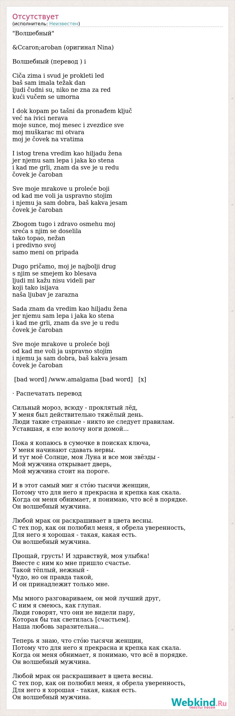 "Волшебный" Čaroban (оригинал Nina) Волшебный (перевод ) i Ciča zima i svud je prokleti led baš sam imala težak dan ljudi čudni su, niko ne zna za red kući vučem se umorna I dok kopam po tašni da pronađem ključ već na ivici nerava moje sunce, moj mesec i zvezdice sve moj muškarac mi otvara moj je čovek na vratima I istog trena vredim kao hiljadu žena jer njemu sam lepa i jaka ko stena i kad me grli, znam da sve je u redu čovek je čaroban Sve moje mrakove u proleće boji od kad me voli ja uspravno stojim i njemu ja sam dobra, baš kakva jesam čovek je čaroban Zbogom tugo i zdravo osmehu moj sreća s njim se doselila tako topao, nežan i predivno svoj samo meni on pripada Dugo pričamo, moj je najbolji drug s njim se smejem ko blesava ljudi mi kažu nisu videli par koji tako isijava naša ljubav je zarazna Sada znam da vredim kao hiljadu žena jer njemu sam lepa i jaka ko stena i kad me grli, znam da sve je u redu čovek je čaroban Sve moje mrakove u proleće boji od kad me voli ja uspravno stojim i njemu ja sam dobra, baš kakva jesam čovek je čaroban [bad word] /www.amalgama [bad word] [x] · Распечатать перевод Сильный мороз, всюду - проклятый лёд, У меня был действительно тяжёлый день. Люди такие странные - никто не следует правилам. Уставшая, я еле волочу ноги домой... Пока я копаюсь в сумочке в поисках ключа, У меня начинают сдавать нервы. И тут моё Солнце, моя Луна и все мои звёзды - Мой мужчина открывает дверь, Мой мужчина стоит на пороге. И в этот самый миг я стóю тысячи женщин, Потому что для него я прекрасна и крепка как скала. Когда он меня обнимает, я понимаю, что всё в порядке. Он волшебный мужчина. Любой мрак он раскрашивает в цвета весны. С тех пор, как он полюбил меня, я обрела уверенность, Для него я хорошая - такая, какая есть. Он волшебный мужчина. Прощай, грусть! И здравствуй, моя улыбка! Вместе с ним ко мне пришло счастье. Такой тёплый, нежный - Чудо, но он правда такой, И он принадлежит только мне. Мы много разговариваем, он мой лучший друг, С ним я смеюсь, как глупая. Люди говорят, что они не видели пару, Которая бы так светилась [счастьем]. Наша любовь заразительна... Теперь я знаю, что стóю тысячи женщин, Потому что для него я прекрасна и крепка как скала. Когда он меня обнимает, я понимаю, что всё в порядке. Он волшебный мужчина. Любой мрак он раскрашивает в цвета весны. С тех пор, как он полюбил меня, я обрела уверенность, Для него я хорошая - такая, какая есть. Он волшебный мужчина.
