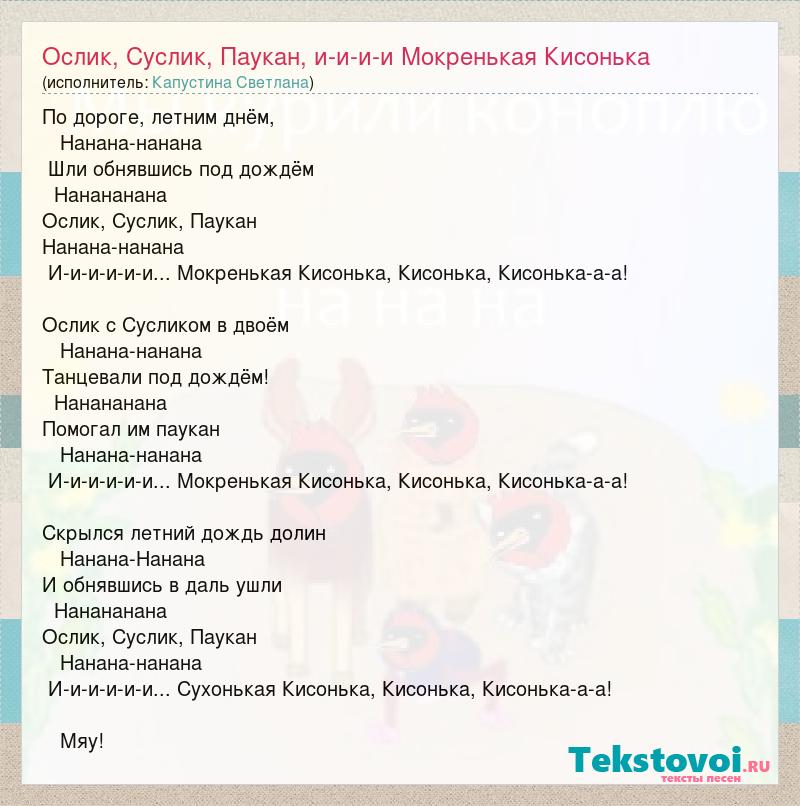 По дороге, летним днём, Нанана-нанана Шли обнявшись под дождём Нанананана Ослик, Суслик, Паукан Нанана-нанана И-и-и-и-и-и... Мокренькая Кисонька, Кисонька, Кисонька-а-а! Ослик с Сусликом в двоём Нанана-нанана Танцевали под дождём! Нанананана Помогал им паукан Нанана-нанана И-и-и-и-и-и... Мокренькая Кисонька, Кисонька, Кисонька-а-а! Скрылся летний дождь долин Нанана-Нанана И обнявшись в даль ушли Нанананана Ослик, Суслик, Паукан Нанана-нанана И-и-и-и-и-и... Сухонькая Кисонька, Кисонька, Кисонька-а-а! Мяу!