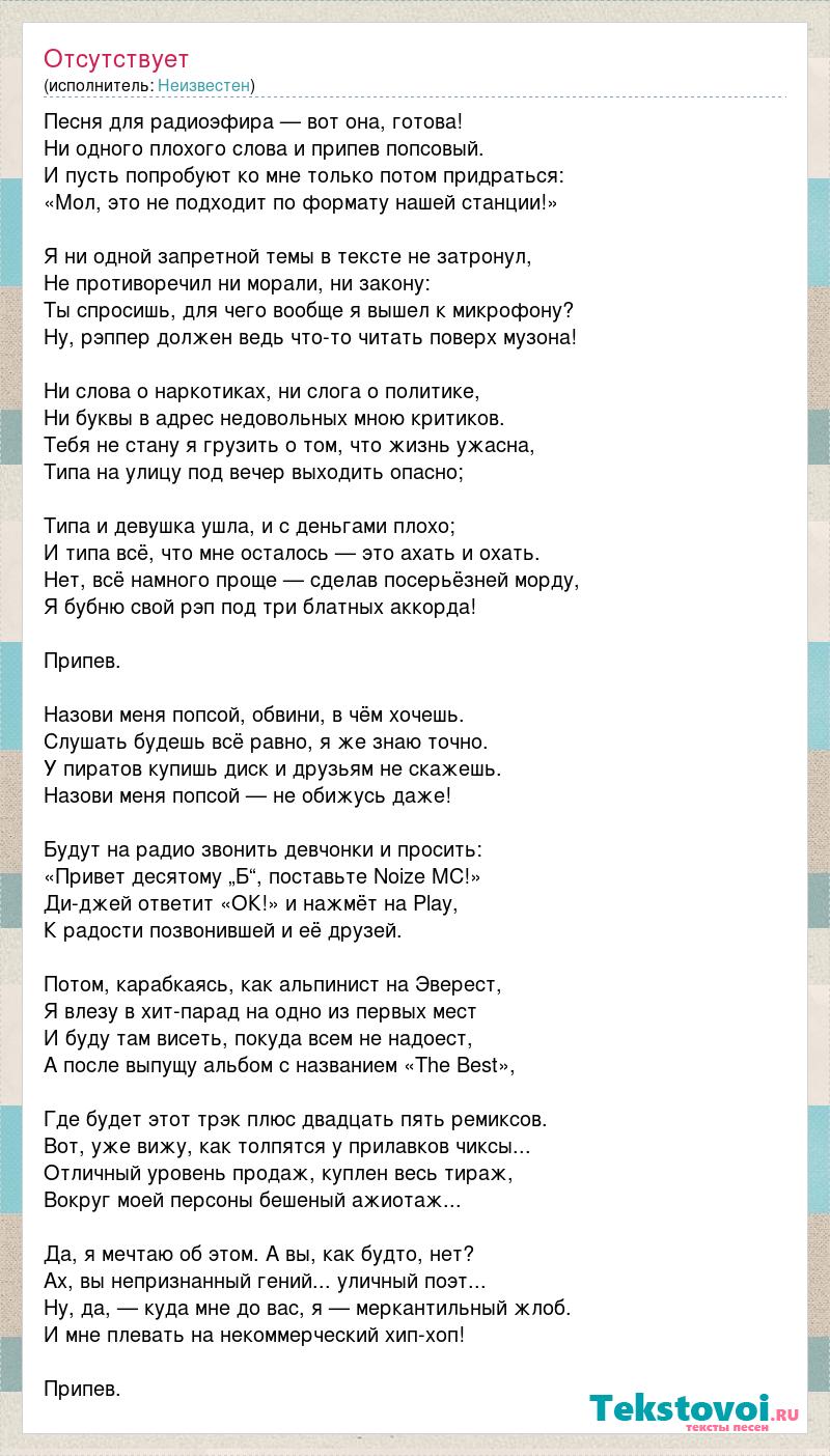 Песня для радиоэфира — вот она, готова! Ни одного плохого слова и припев попсовый. И пусть попробуют ко мне только потом придраться: «Мол, это не подходит по формату нашей станции!» Я ни одной запретной темы в тексте не затронул, Не противоречил ни морали, ни закону: Ты спросишь, для чего вообще я вышел к микрофону? Ну, рэппер должен ведь что-то читать поверх музона! Ни слова о наркотиках, ни слога о политике, Ни буквы в адрес недовольных мною критиков. Тебя не стану я грузить о том, что жизнь ужасна, Типа на улицу под вечер выходить опасно; Типа и девушка ушла, и с деньгами плохо; И типа всё, что мне осталось — это ахать и охать. Нет, всё намного проще — сделав посерьёзней морду, Я бубню свой рэп под три блатных аккорда! Припев. Назови меня попсой, обвини, в чём хочешь. Слушать будешь всё равно, я же знаю точно. У пиратов купишь диск и друзьям не скажешь. Назови меня попсой — не обижусь даже! Будут на радио звонить девчонки и просить: «Привет десятому „Б“, поставьте Noize MC!» Ди-джей ответит «ОК!» и нажмёт на Play, К радости позвонившей и её друзей. Потом, карабкаясь, как альпинист на Эверест, Я влезу в хит-парад на одно из первых мест И буду там висеть, покуда всем не надоест, А после выпущу альбом с названием «The Best», Где будет этот трэк плюс двадцать пять ремиксов. Вот, уже вижу, как толпятся у прилавков чиксы... Отличный уровень продаж, куплен весь тираж, Вокруг моей персоны бешеный ажиотаж... Да, я мечтаю об этом. А вы, как будто, нет? Ах, вы непризнанный гений... уличный поэт... Ну, да, — куда мне до вас, я — меркантильный жлоб. И мне плевать на некоммерческий хип-хоп! Припев.