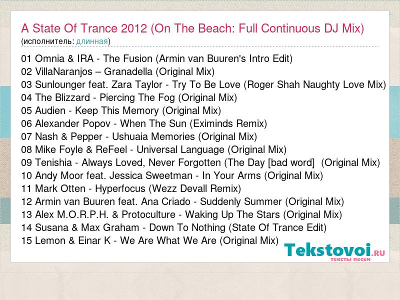 А как ты думаешь, о чем песня "A State Of Trance 2012 (On The Beach: Full Continuous DJ Mix)" ?