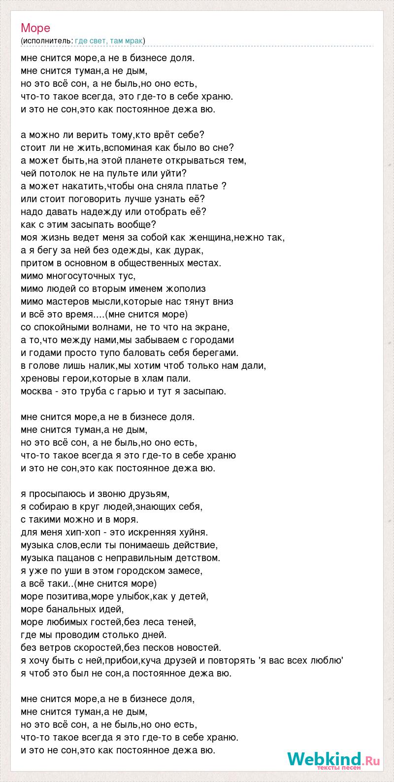 мне снится море,а не в бизнесе доля. мне снится туман,а не дым, но это всё сон, а не быль,но оно есть, что-то такое всегда, это где-то в себе храню. и это не сон,это как постоянное дежа вю. а можно ли верить тому,кто врёт себе? стоит ли не жить,вспоминая как было во сне? а может быть,на этой планете открываться тем, чей потолок не на пульте или уйти? а может накатить,чтобы она сняла платье ? или стоит поговорить лучше узнать её? надо давать надежду или отобрать её? как с этим засыпать вообще? моя жизнь ведет меня за собой как женщина,нежно так, а я бегу за ней без одежды, как дурак, притом в основном в общественных местах. мимо многосуточных тус, мимо людей со вторым именем жополиз мимо мастеров мысли,которые нас тянут вниз и всё это время....(мне снится море) со спокойными волнами, не то что на экране, а то,что между нами,мы забываем с городами и годами просто тупо баловать себя берегами. в голове лишь налик,мы хотим чтоб только нам дали, хреновы герои,которые в хлам пали. москва - это труба с гарью и тут я засыпаю. мне снится море,а не в бизнесе доля. мне снится туман,а не дым, но это всё сон, а не быль,но оно есть, что-то такое всегда я это где-то в себе храню и это не сон,это как постоянное дежа вю. я просыпаюсь и звоню друзьям, я собираю в круг людей,знающих себя, с такими можно и в моря. для меня хип-хоп - это искренняя хуйня. музыка слов,если ты понимаешь действие, музыка пацанов с неправильным детством. я уже по уши в этом городском замесе, а всё таки..(мне снится море) море позитива,море улыбок,как у детей, море банальных идей, море любимых гостей,без леса теней, где мы проводим столько дней. без ветров скоростей,без песков новостей. я хочу быть с ней,прибои,куча друзей и повторять 'я вас всех люблю' я чтоб это был не сон,а постоянное дежа вю. мне снится море,а не в бизнесе доля, мне снится туман,а не дым, но это всё сон, а не быль,но оно есть, что-то такое всегда я это где-то в себе храню. и это не сон,это как постоянное дежа вю.