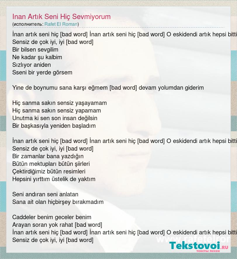 İnan artık seni hiç sevmiyorum İnan artık seni hiç istemiyorum O eskidendi artık hepsi bitti Sensiz de çok iyi, iyi yaşıyorum Bir bilsen sevgilim Ne kadar şu kalbim Sızlıyor aniden Sseni bir yerde görsem Yine de boynumu sana karşı eğmem Gururumla devam yolumdan giderim Hiç sanma sakın sensiz yaşayamam Hiç sanma sakın sensiz yapamam Unutma ki sen son insan değilsin Bir başkasıyla yeniden başladım İnan artık seni hiç sevmiyorum İnan artık seni hiç istemiyorum O eskidendi artık hepsi bitti Sensiz de çok iyi, iyi yaşıyorum Bir zamanlar bana yazdığın Bütün mektupları bütün şiirleri Çektirdiğimiz bütün resimleri Hepsini yırttım üstelik de yaktım Seni andıran seni anlatan Sana ait olan hiçbirşey bırakmadım Caddeler benim geceler benim Arayan soran yok rahat yaşıyorum İnan artık seni hiç sevmiyorum İnan artık seni hiç istemiyorum O eskidendi artık hepsi bitti Sensiz de çok iyi, iyi yaşıyorum