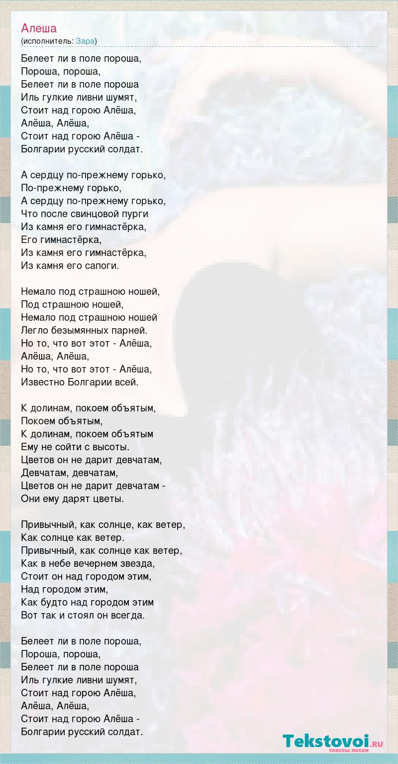 Белеет ли в поле пороша, Пороша, пороша, Белеет ли в поле пороша Иль гулкие ливни шумят, Стоит над горою Алёша, Алёша, Алёша, Стоит над горою Алёша - Болгарии русский солдат. А сердцу по-прежнему горько, По-прежнему горько, А сердцу по-прежнему горько, Что после свинцовой пурги Из камня его гимнастёрка, Его гимнастёрка, Из камня его гимнастёрка, Из камня его сапоги. Немало под страшною ношей, Под страшною ношей, Немало под страшною ношей Легло безымянных парней. Но то, что вот этот - Алёша, Алёша, Алёша, Но то, что вот этот - Алёша, Известно Болгарии всей. К долинам, покоем объятым, Покоем объятым, К долинам, покоем объятым Ему не сойти с высоты. Цветов он не дарит девчатам, Девчатам, девчатам, Цветов он не дарит девчатам - Они ему дарят цветы. Привычный, как солнце, как ветер, Как солнце как ветер. Привычный, как солнце как ветер, Как в небе вечернем звезда, Стоит он над городом этим, Над городом этим, Как будто над городом этим Вот так и стоял он всегда. Белеет ли в поле пороша, Пороша, пороша, Белеет ли в поле пороша Иль гулкие ливни шумят, Стоит над горою Алёша, Алёша, Алёша, Стоит над горою Алёша - Болгарии русский солдат.
