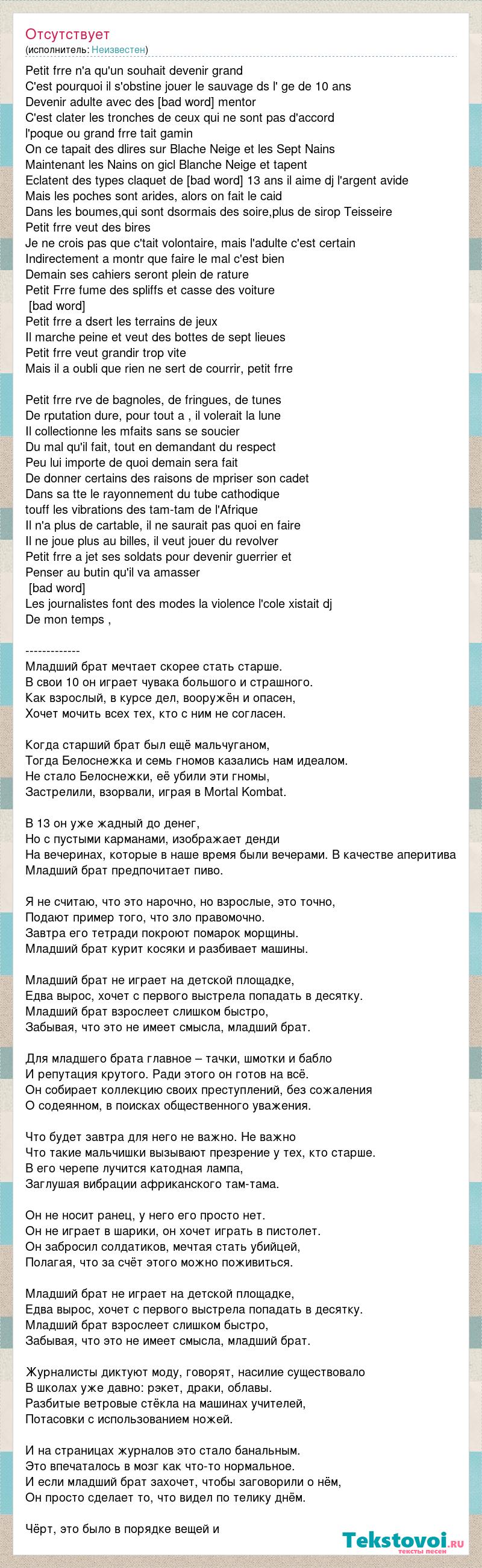 Petit frre n'a qu'un souhait devenir grand C'est pourquoi il s'obstine jouer le sauvage ds l' ge de 10 ans Devenir adulte avec des infos comme mentor C'est clater les tronches de ceux qui ne sont pas d'accord l'poque ou grand frre tait gamin On ce tapait des dlires sur Blache Neige et les Sept Nains Maintenant les Nains on gicl Blanche Neige et tapent Eclatent des types claquet de Mortal Combat 13 ans il aime dj l'argent avide Mais les poches sont arides, alors on fait le caid Dans les boumes,qui sont dsormais des soire,plus de sirop Teisseire Petit frre veut des bires Je ne crois pas que c'tait volontaire, mais l'adulte c'est certain Indirectement a montr que faire le mal c'est bien Demain ses cahiers seront plein de rature Petit Frre fume des spliffs et casse des voiture Chorus: Petit frre a dsert les terrains de jeux Il marche peine et veut des bottes de sept lieues Petit frre veut grandir trop vite Mais il a oubli que rien ne sert de courrir, petit frre Petit frre rve de bagnoles, de fringues, de tunes De rputation dure, pour tout a , il volerait la lune Il collectionne les mfaits sans se soucier Du mal qu'il fait, tout en demandant du respect Peu lui importe de quoi demain sera fait De donner certains des raisons de mpriser son cadet Dans sa tte le rayonnement du tube cathodique touff les vibrations des tam-tam de l'Afrique Il n'a plus de cartable, il ne saurait pas quoi en faire Il ne joue plus au billes, il veut jouer du revolver Petit frre a jet ses soldats pour devenir guerrier et Penser au butin qu'il va amasser Chorus Les journalistes font des modes la violence l'cole xistait dj De mon temps , ------------- Младший брат мечтает скорее стать старше. В свои 10 он играет чувака большого и страшного. Как взрослый, в курсе дел, вооружён и опасен, Хочет мочить всех тех, кто с ним не согласен. Когда старший брат был ещё мальчуганом, Тогда Белоснежка и семь гномов казались нам идеалом. Не стало Белоснежки, её убили эти гномы, Застрелили, взорвали, играя в Mortal Kombat. В 13 он уже жадный до денег, Но с пустыми карманами, изображает денди На вечеринах, которые в наше время были вечерами. В качестве аперитива Младший брат предпочитает пиво. Я не считаю, что это нарочно, но взрослые, это точно, Подают пример того, что зло правомочно. Завтра его тетради покроют помарок морщины. Младший брат курит косяки и разбивает машины. Младший брат не играет на детской площадке, Едва вырос, хочет с первого выстрела попадать в десятку. Младший брат взрослеет слишком быстро, Забывая, что это не имеет смысла, младший брат. Для младшего брата главное – тачки, шмотки и бабло И репутация крутого. Ради этого он готов на всё. Он собирает коллекцию своих преступлений, без сожаления О содеянном, в поисках общественного уважения. Что будет завтра для него не важно. Не важно Что такие мальчишки вызывают презрение у тех, кто старше. В его черепе лучится катодная лампа, Заглушая вибрации африканского там-тама. Он не носит ранец, у него его просто нет. Он не играет в шарики, он хочет играть в пистолет. Он забросил солдатиков, мечтая стать убийцей, Полагая, что за счёт этого можно поживиться. Младший брат не играет на детской площадке, Едва вырос, хочет с первого выстрела попадать в десятку. Младший брат взрослеет слишком быстро, Забывая, что это не имеет смысла, младший брат. Журналисты диктуют моду, говорят, насилие существовало В школах уже давно: рэкет, драки, облавы. Разбитые ветровые стёкла на машинах учителей, Потасовки с использованием ножей. И на страницах журналов это стало банальным. Это впечаталось в мозг как что-то нормальное. И если младший брат захочет, чтобы заговорили о нём, Он просто сделает то, что видел по телику днём. Чёрт, это было в порядке вещей и