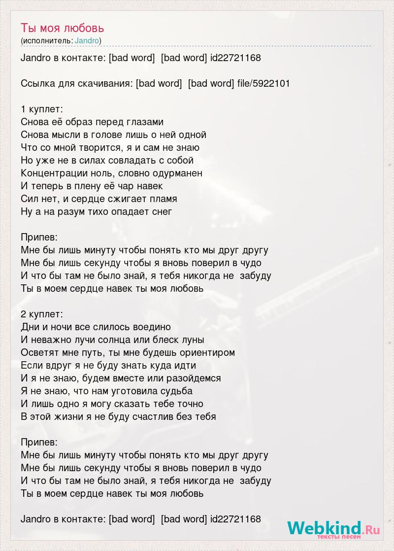 Jandro в контакте: [bad word] [bad word] id22721168 Ссылка для скачивания: [bad word] [bad word] file/5922101 1 куплет: Снова её образ перед глазами Снова мысли в голове лишь о ней одной Что со мной творится, я и сам не знаю Но уже не в силах совладать с собой Концентрации ноль, словно одурманен И теперь в плену её чар навек Сил нет, и сердце сжигает пламя Ну а на разум тихо опадает снег Припев: Мне бы лишь минуту чтобы понять кто мы друг другу Мне бы лишь секунду чтобы я вновь поверил в чудо И что бы там не было знай, я тебя никогда не забуду Ты в моем сердце навек ты моя любовь 2 куплет: Дни и ночи все слилось воедино И неважно лучи солнца или блеск луны Осветят мне путь, ты мне будешь ориентиром Если вдруг я не буду знать куда идти И я не знаю, будем вместе или разойдемся Я не знаю, что нам уготовила судьба И лишь одно я могу сказать тебе точно В этой жизни я не буду счастлив без тебя Припев: Мне бы лишь минуту чтобы понять кто мы друг другу Мне бы лишь секунду чтобы я вновь поверил в чудо И что бы там не было знай, я тебя никогда не забуду Ты в моем сердце навек ты моя любовь Jandro в контакте: [bad word] [bad word] id22721168