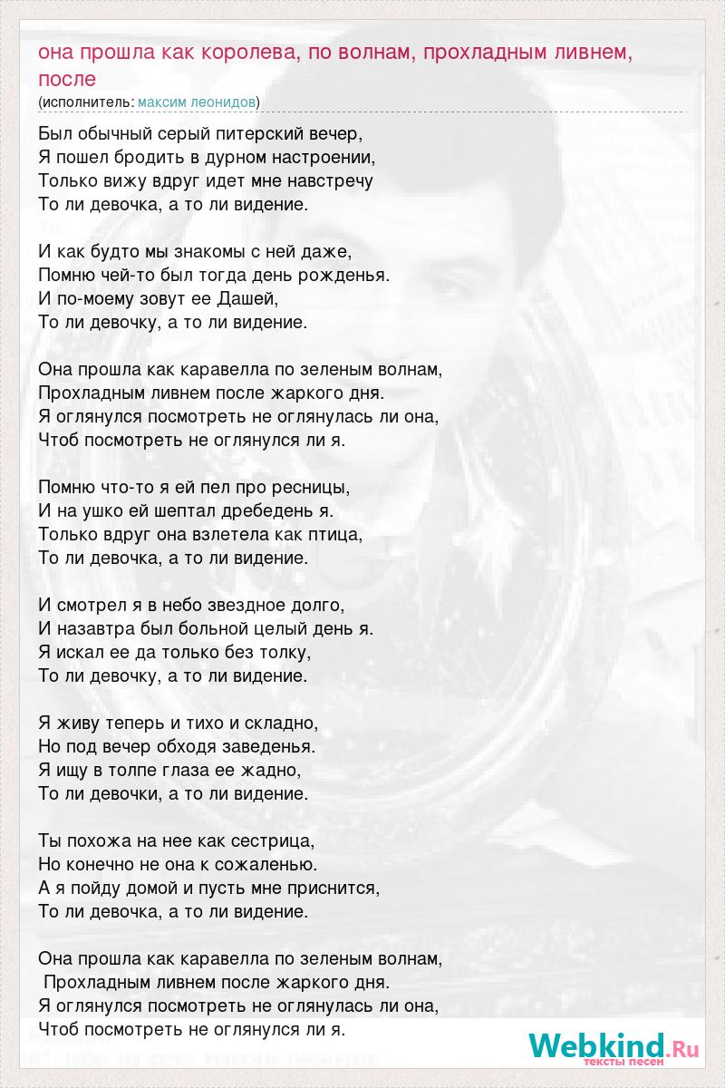 Главная→Исполнители→Максим Леонидов→Она прошла как королева, по волнам, прохладным ливнем, после жаркого дня, я огля