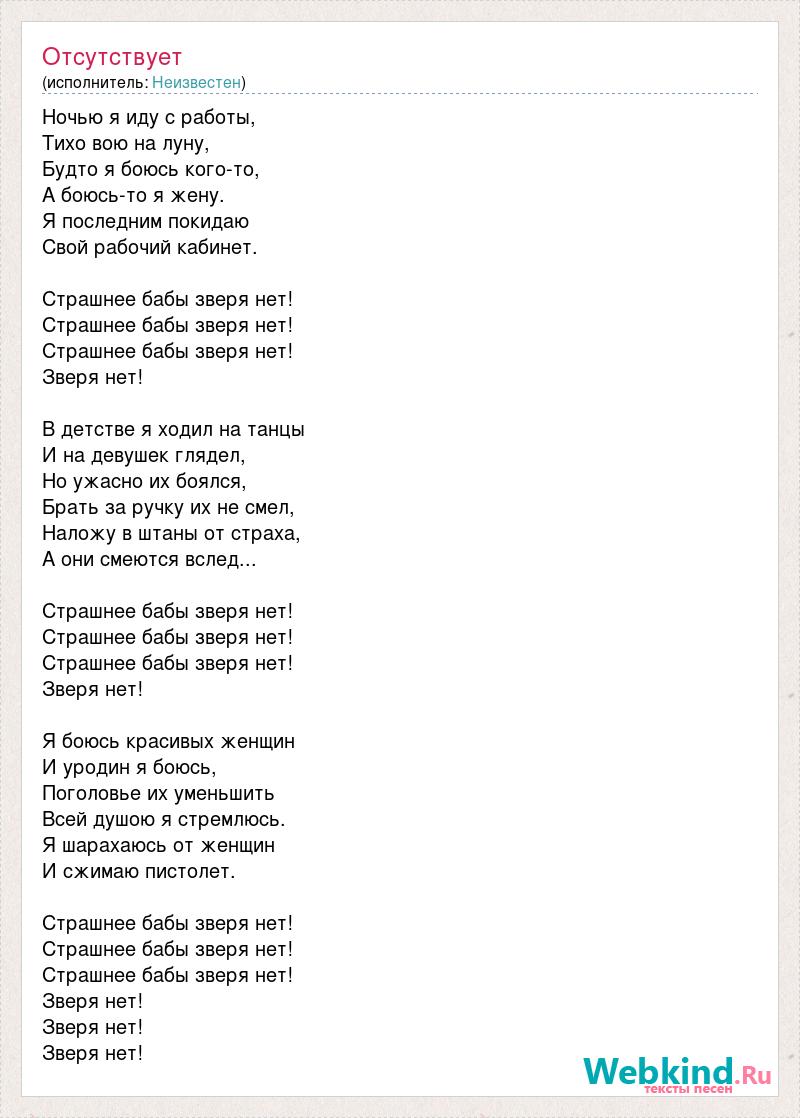 Ночью я иду с работы, Тихо вою на луну, Будто я боюсь кого-то, А боюсь-то я жену. Я последним покидаю Свой рабочий кабинет. Страшнее бабы зверя нет! Страшнее бабы зверя нет! Страшнее бабы зверя нет! Зверя нет! В детстве я ходил на танцы И на девушек глядел, Но ужасно их боялся, Брать за ручку их не смел, Наложу в штаны от страха, А они смеются вслед... Страшнее бабы зверя нет! Страшнее бабы зверя нет! Страшнее бабы зверя нет! Зверя нет! Я боюсь красивых женщин И уродин я боюсь, Поголовье их уменьшить Всей душою я стремлюсь. Я шарахаюсь от женщин И сжимаю пистолет. Страшнее бабы зверя нет! Страшнее бабы зверя нет! Страшнее бабы зверя нет! Зверя нет! Зверя нет! Зверя нет!