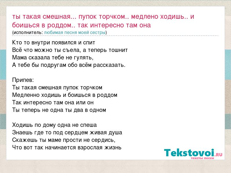 Кто то внутри появился и спит Всё что можно ты съела, а теперь тошнит Мама сказала тебе не гулять, А тебе бы подругам обо всём рассказать. Припев: Ты такая смешная пупок торчком Медленно ходишь и боишься в роддом Так интересно там она или он Ты теперь не одна ты два в одном Ходишь по дому одна не спеша Знаешь где то под сердцем живая душа Скажешь ты маме прости не сердись, Что вот так начинается взрослая жизнь