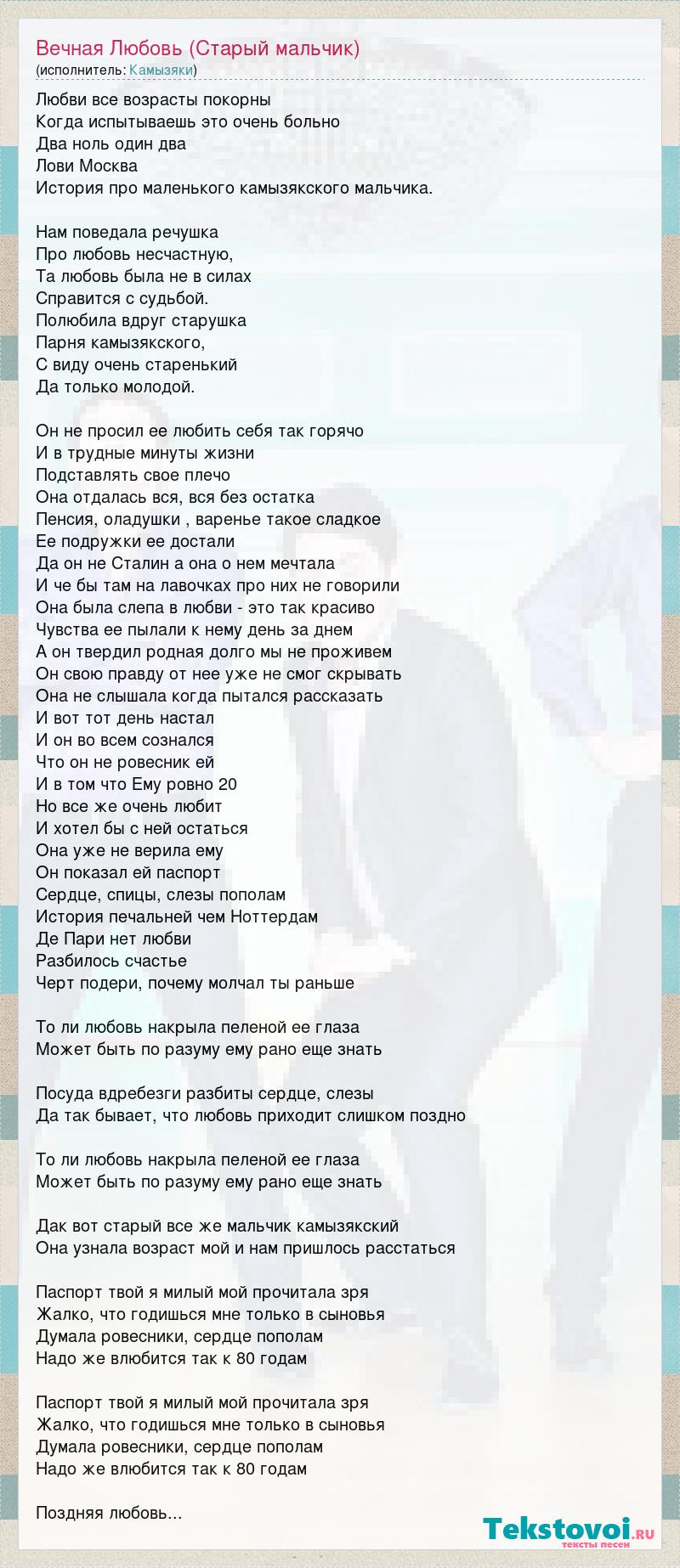 Любви все возрасты покорны Когда испытываешь это очень больно Два ноль один два Лови Москва История про маленького камызякского мальчика. Нам поведала речушка Про любовь несчастную, Та любовь была не в силах Справится с судьбой. Полюбила вдруг старушка Парня камызякского, С виду очень старенький Да только молодой. Он не просил ее любить себя так горячо И в трудные минуты жизни Подставлять свое плечо Она отдалась вся, вся без остатка Пенсия, оладушки , варенье такое сладкое Ее подружки ее достали Да он не Сталин а она о нем мечтала И че бы там на лавочках про них не говорили Она была слепа в любви - это так красиво Чувства ее пылали к нему день за днем А он твердил родная долго мы не проживем Он свою правду от нее уже не смог скрывать Она не слышала когда пытался рассказать И вот тот день настал И он во всем сознался Что он не ровесник ей И в том что Ему ровно 20 Но все же очень любит И хотел бы с ней остаться Она уже не верила ему Он показал ей паспорт Сердце, спицы, слезы пополам История печальней чем Ноттердам Де Пари нет любви Разбилось счастье Черт подери, почему молчал ты раньше То ли любовь накрыла пеленой ее глаза Может быть по разуму ему рано еще знать Посуда вдребезги разбиты сердце, слезы Да так бывает, что любовь приходит слишком поздно То ли любовь накрыла пеленой ее глаза Может быть по разуму ему рано еще знать Дак вот старый все же мальчик камызякский Она узнала возраст мой и нам пришлось расстаться Паспорт твой я милый мой прочитала зря Жалко, что годишься мне только в сыновья Думала ровесники, сердце пополам Надо же влюбится так к 80 годам Паспорт твой я милый мой прочитала зря Жалко, что годишься мне только в сыновья Думала ровесники, сердце пополам Надо же влюбится так к 80 годам Поздняя любовь...