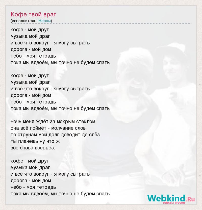 кофе - мой друг музыка мой драг и всё что вокруг - я могу сыграть дорога - мой дом небо - моя тетрадь пока мы вдвоём, мы точно не будем спать кофе - мой друг музыка мой драг и всё что вокруг - я могу сыграть дорога - мой дом небо - моя тетрадь пока мы вдвоём, мы точно не будем спать ночь меня ждёт за мокрым стеклом она всё поймёт - молчание слов по струнам мой долг доводит до слёз ты плачешь ну что ж всё снова всерьёз. кофе - мой друг музыка мой драг и всё что вокруг - я могу сыграть дорога - мой дом небо - моя тетрадь пока мы вдвоём, мы точно не будем спать