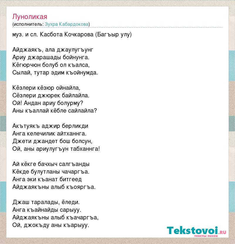 муз. и сл. Касбота Кочкарова (Багъыр улу) Айджаякъ, ала джаулугъунг Ариу джарашады бойнунга. Кёгюрчюн болуб ол къалса, Сылай, тутар эдим къойнумда. Кёзлери кёзюр ойнайла, Сёзлери джюрек байлайла. Ой! Андан ариу болурму? Аны къаллай кёбле сайлайла? Акътуякъ аджир берликди Анга келечилик айтханнга. Джети джандет бош болсун, Ой, аны ариулугъун табханнга! Ай кёкге бачхыч салгъанды Кёкде булутланы чачаргъа. Анга эки къанат битгеед Айджаякъны алыб къояргъа. Джаш таралады, ёледи. Анга къайнайды сарыуу. Айджаякъны алыб къачаргъа, Ой, джокъду аны къарыуу.