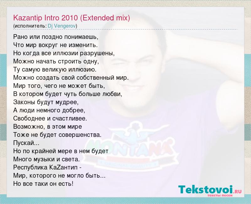 Рано или поздно понимаешь, Что мир вокруг не изменить. Но когда все иллюзии разрушены, Можно начать строить одну, Ту самую великую иллюзию. Можно создать свой собственный мир. Мир того, чего не может быть, В котором будет чуть больше любви, Законы будут мудрее, А люди немного добрее, Свободнее и счастливее. Возможно, в этом мире Тоже не будет совершенства. Пускай... Но по крайней мере в нем будет Много музыки и света. Республика КаZантип - Мир, которого не могло быть... Но все таки он есть!