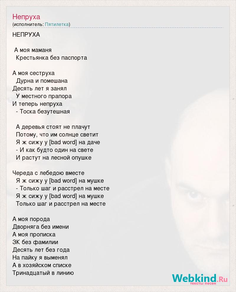 НЕПРУХА А моя маманя Крестьянка без паспорта А моя сеструха Дурна и помешана Десять лет я занял У местного прапора И теперь непруха - Тоска безутешная А деревья стоят не плачут Потому, что им солнце светит Я ж сижу у [bad word] на даче - И как будто один на свете И растут на лесной опушке Череда с лебедою вместе Я ж сижу у [bad word] на мушке - Только шаг и расстрел на месте Я ж сижу у [bad word] на мушке Только шаг и расстрел на месте А моя порода Дворняга без имени А моя прописка ЗК без фамилии Десять лет без года На пайку я выменял А в хозяйском списке Тринадцатый в линию