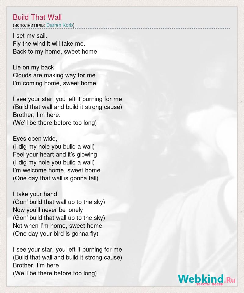 I set my sail. Fly the wind it will take me. Back to my home, sweet home Lie on my back Clouds are making way for me I’m coming home, sweet home I see your star, you left it burning for me (Build that wall and build it strong cause) Brother, I’m here. (We’ll be there before too long) Eyes open wide, (I dig my hole you build a wall) Feel your heart and it’s glowing (I dig my hole you build a wall) I’m welcome home, sweet home (One day that wall is gonna fall) I take your hand (Gon’ build that wall up to the sky) Now you’ll never be lonely (Gon’ build that wall up to the sky) Not when I’m home, sweet home (One day your bird is gonna fly) I see your star, you left it burning for me (Build that wall and build it strong cause) Brother, I’m here (We’ll be there before too long)