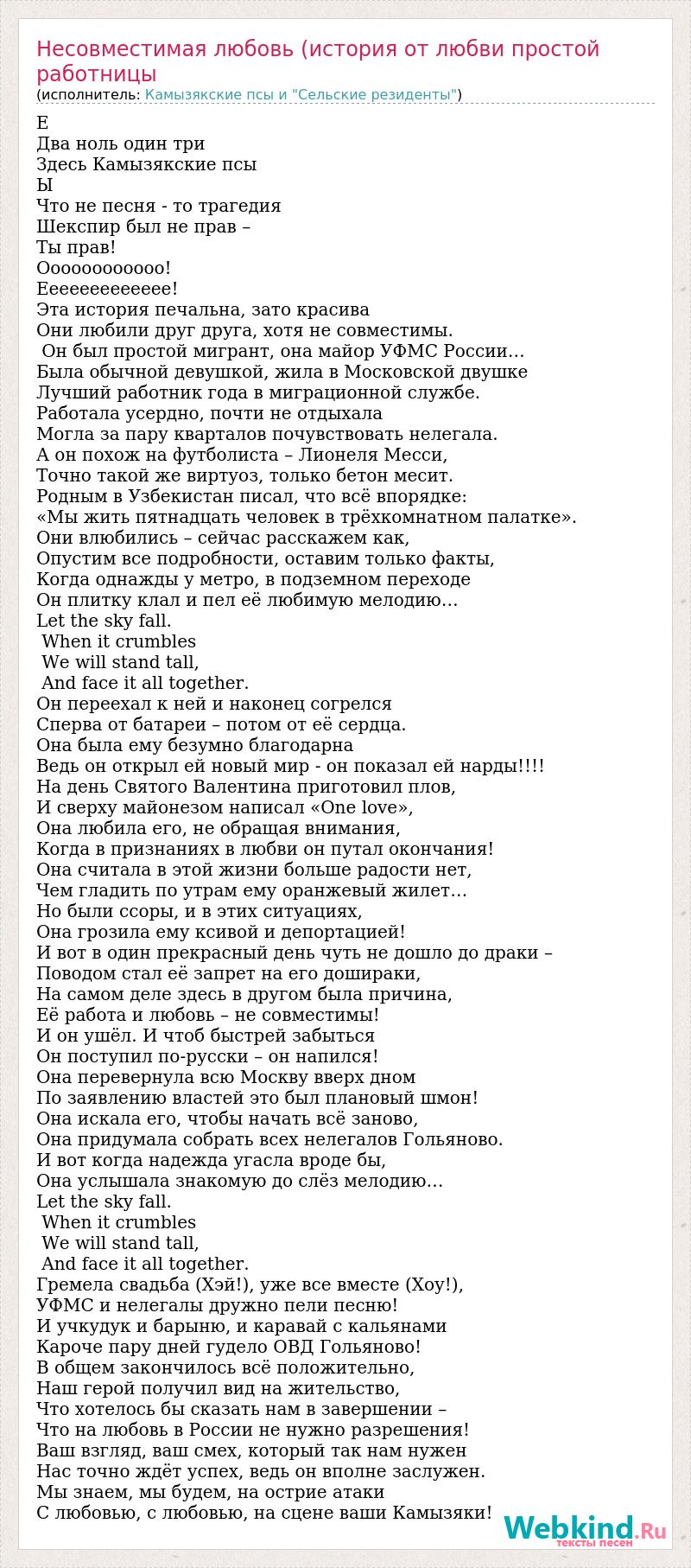Е Два ноль один три Здесь Камызякские псы Ы Что не песня - то трагедия Шекспир был не прав – Ты прав! Оооооооооооо! Еееееееееееее! Эта история печальна, зато красива Они любили друг друга, хотя не совместимы. Он был простой мигрант, она майор УФМС России… Была обычной девушкой, жила в Московской двушке Лучший работник года в миграционной службе. Работала усердно, почти не отдыхала Могла за пару кварталов почувствовать нелегала. А он похож на футболиста – Лионеля Месси, Точно такой же виртуоз, только бетон месит. Родным в Узбекистан писал, что всё впорядке: «Мы жить пятнадцать человек в трёхкомнатном палатке». Они влюбились – сейчас расскажем как, Опустим все подробности, оставим только факты, Когда однажды у метро, в подземном переходе Он плитку клал и пел её любимую мелодию… Let the sky fall. When it crumbles We will stand tall, And face it all together. Он переехал к ней и наконец согрелся Сперва от батареи – потом от её сердца. Она была ему безумно благодарна Ведь он открыл ей новый мир - он показал ей нарды!!!! На день Святого Валентина приготовил плов, И сверху майонезом написал «One love», Она любила его, не обращая внимания, Когда в признаниях в любви он путал окончания! Она считала в этой жизни больше радости нет, Чем гладить по утрам ему оранжевый жилет… Но были ссоры, и в этих ситуациях, Она грозила ему ксивой и депортацией! И вот в один прекрасный день чуть не дошло до драки – Поводом стал её запрет на его дошираки, На самом деле здесь в другом была причина, Её работа и любовь – не совместимы! И он ушёл. И чтоб быстрей забыться Он поступил по-русски – он напился! Она перевернула всю Москву вверх дном По заявлению властей это был плановый шмон! Она искала его, чтобы начать всё заново, Она придумала собрать всех нелегалов Гольяново. И вот когда надежда угасла вроде бы, Она услышала знакомую до слёз мелодию… Let the sky fall. When it crumbles We will stand tall, And face it all together. Гремела свадьба (Хэй!), уже все вместе (Хоу!), УФМС и нелегалы дружно пели песню! И учкудук и барыню, и каравай с кальянами Кароче пару дней гудело ОВД Гольяново! В общем закончилось всё положительно, Наш герой получил вид на жительство, Что хотелось бы сказать нам в завершении – Что на любовь в России не нужно разрешения! Ваш взгляд, ваш смех, который так нам нужен Нас точно ждёт успех, ведь он вполне заслужен. Мы знаем, мы будем, на острие атаки С любовью, с любовью, на сцене ваши Камызяки!