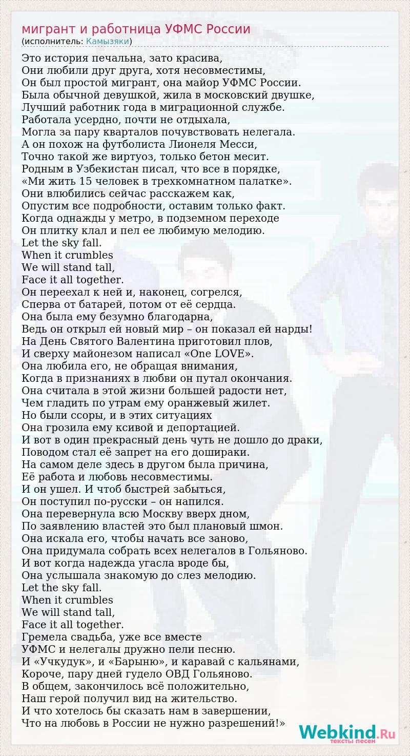 Это история печальна, зато красива, Они любили друг друга, хотя несовместимы, Он был простой мигрант, она майор УФМС России. Была обычной девушкой, жила в московский двушке, Лучший работник года в миграционной службе. Работала усердно, почти не отдыхала, Могла за пару кварталов почувствовать нелегала. А он похож на футболиста Лионеля Месси, Точно такой же виртуоз, только бетон месит. Родным в Узбекистан писал, что все в порядке, «Ми жить 15 человек в трехкомнатном палатке». Они влюбились сейчас расскажем как, Опустим все подробности, оставим только факт. Когда однажды у метро, в подземном переходе Он плитку клал и пел ее любимую мелодию. Let the sky fall. When it crumbles We will stand tall, Face it all together. Он переехал к ней и, наконец, согрелся, Сперва от батарей, потом от её сердца. Она была ему безумно благодарна, Ведь он открыл ей новый мир – он показал ей нарды! На День Святого Валентина приготовил плов, И сверху майонезом написал «One LOVE». Она любила его, не обращая внимания, Когда в признаниях в любви он путал окончания. Она считала в этой жизни большей радости нет, Чем гладить по утрам ему оранжевый жилет. Но были ссоры, и в этих ситуациях Она грозила ему ксивой и депортацией. И вот в один прекрасный день чуть не дошло до драки, Поводом стал её запрет на его дошираки. На самом деле здесь в другом была причина, Её работа и любовь несовместимы. И он ушел. И чтоб быстрей забыться, Он поступил по-русски – он напился. Она перевернула всю Москву вверх дном, По заявлению властей это был плановый шмон. Она искала его, чтобы начать все заново, Она придумала собрать всех нелегалов в Гольяново. И вот когда надежда угасла вроде бы, Она услышала знакомую до слез мелодию. Let the sky fall. When it crumbles We will stand tall, Face it all together. Гремела свадьба, уже все вместе УФМС и нелегалы дружно пели песню. И «Учкудук», и «Барыню», и каравай с кальянами, Короче, пару дней гудело ОВД Гольяново. В общем, закончилось всё положительно, Наш герой получил вид на жительство. И что хотелось бы сказать нам в завершении, Что на любовь в России не нужно разрешений!»