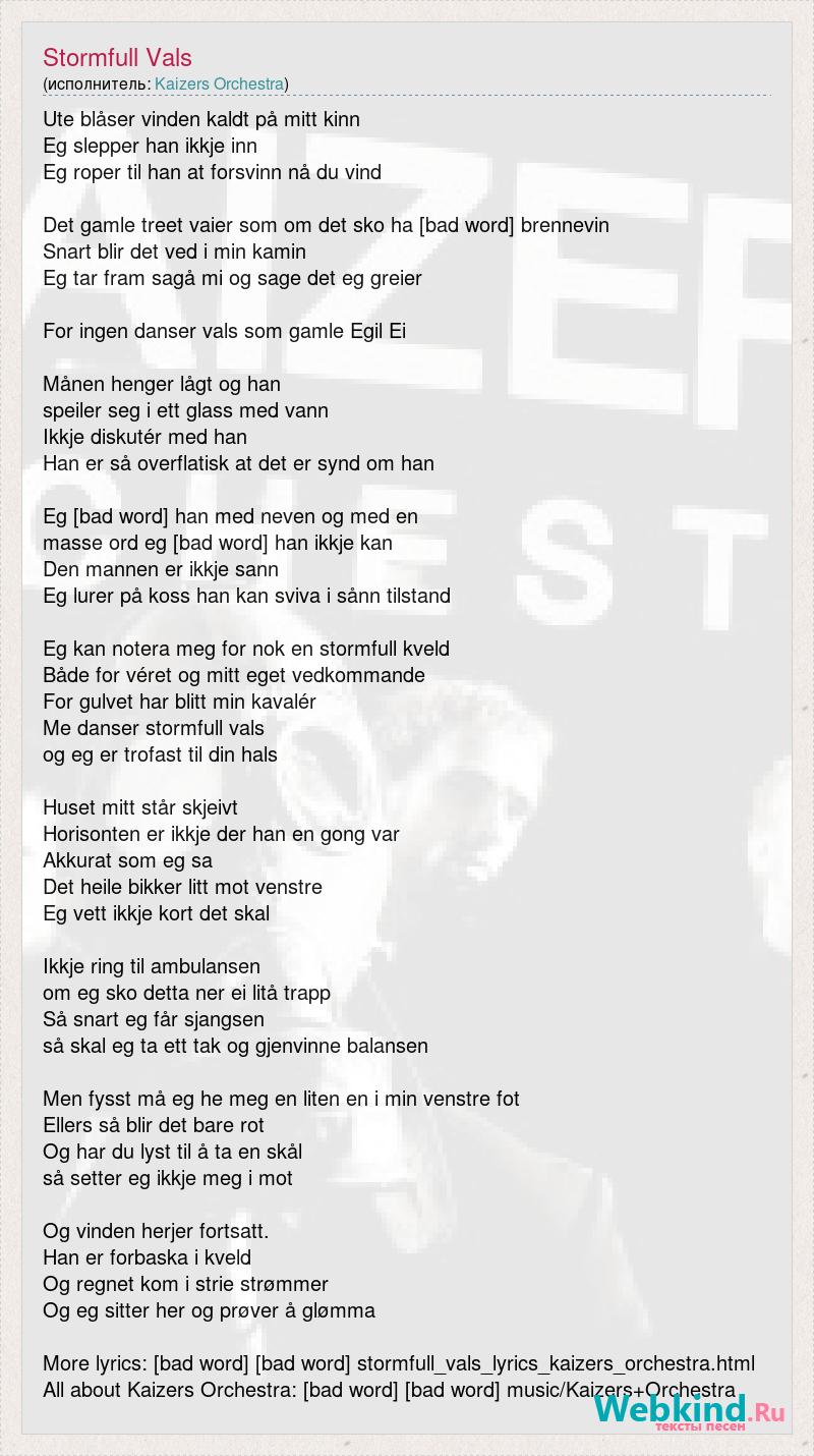 Ute blåser vinden kaldt på mitt kinn Eg slepper han ikkje inn Eg roper til han at forsvinn nå du vind Det gamle treet vaier som om det sko ha [bad word] brennevin Snart blir det ved i min kamin Eg tar fram sagå mi og sage det eg greier For ingen danser vals som gamle Egil Ei Månen henger lågt og han speiler seg i ett glass med vann Ikkje diskutér med han Han er så overflatisk at det er synd om han Eg [bad word] han med neven og med en masse ord eg [bad word] han ikkje kan Den mannen er ikkje sann Eg lurer på koss han kan sviva i sånn tilstand Eg kan notera meg for nok en stormfull kveld Både for véret og mitt eget vedkommande For gulvet har blitt min kavalér Me danser stormfull vals og eg er trofast til din hals Huset mitt står skjeivt Horisonten er ikkje der han en gong var Akkurat som eg sa Det heile bikker litt mot venstre Eg vett ikkje kort det skal Ikkje ring til ambulansen om eg sko detta ner ei litå trapp Så snart eg får sjangsen så skal eg ta ett tak og gjenvinne balansen Men fysst må eg he meg en liten en i min venstre fot Ellers så blir det bare rot Og har du lyst til å ta en skål så setter eg ikkje meg i mot Og vinden herjer fortsatt. Han er forbaska i kveld Og regnet kom i strie strømmer Og eg sitter her og prøver å glømma More lyrics: [bad word] [bad word] stormfull_vals_lyrics_kaizers_orchestra.html All about Kaizers Orchestra: [bad word] [bad word] music/Kaizers+Orchestra