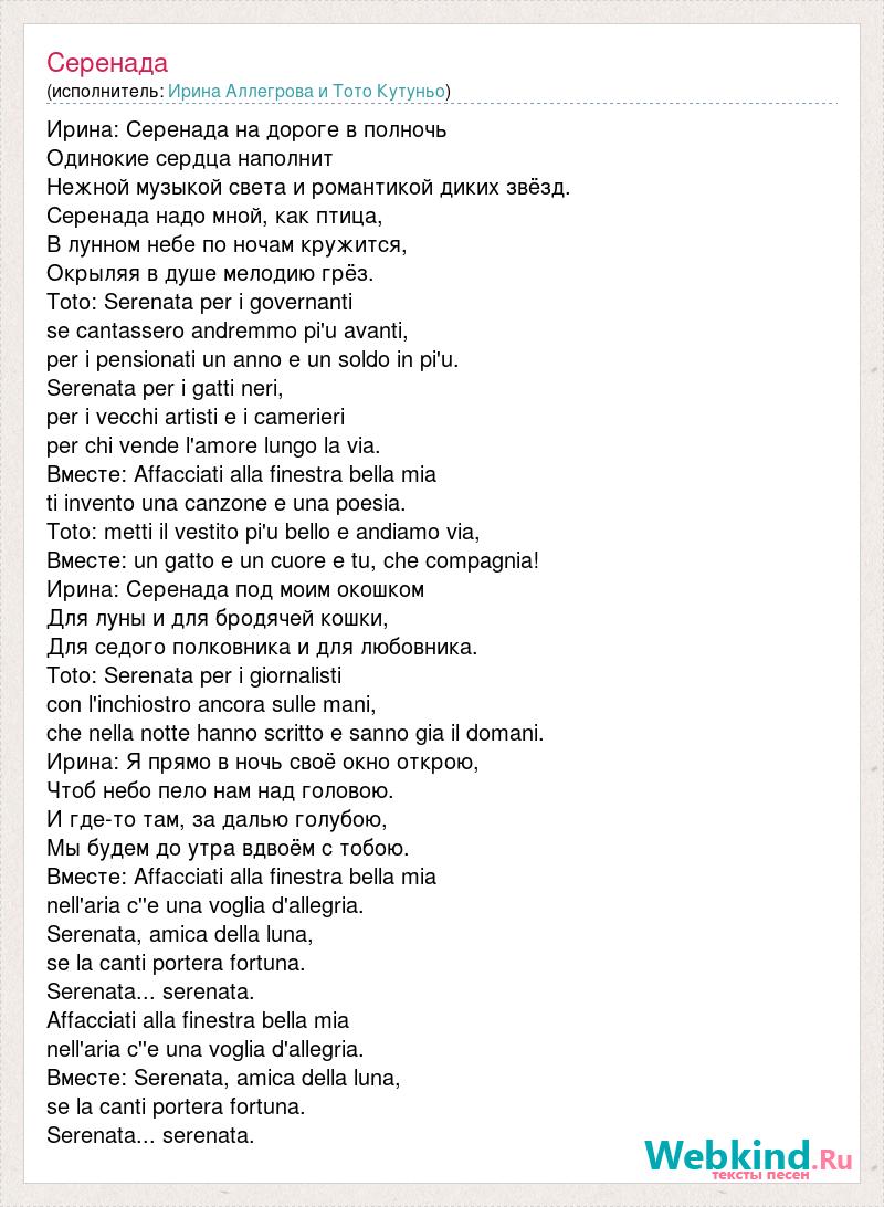 Ирина: Серенада на дороге в полночь Одинокие сердца наполнит Нежной музыкой света и романтикой диких звёзд. Серенада надо мной, как птица, В лунном небе по ночам кружится, Окрыляя в душе мелодию грёз. Toto: Serenata per i governanti se cantassero andremmo pi'u avanti, per i pensionati un anno e un soldo in pi'u. Serenata per i gatti neri, per i vecchi artisti e i camerieri per chi vende l'amore lungo la via. Вместе: Affacciati alla finestra bella mia ti invento una canzone e una poesia. Toto: metti il vestito pi'u bello e andiamo via, Вместе: un gatto e un cuore e tu, che compagnia! Ирина: Серенада под моим окошком Для луны и для бродячей кошки, Для седого полковника и для любовника. Toto: Serenata per i giornalisti con l'inchiostro ancora sulle mani, che nella notte hanno scritto e sanno giа il domani. Ирина: Я прямо в ночь своё окно открою, Чтоб небо пело нам над головою. И где-то там, за далью голубою, Мы будем до утра вдвоём с тобою. Вместе: Affacciati alla finestra bella mia nell'aria c''e una voglia d'allegria. Serenata, amica della luna, se la canti porterа fortuna. Serenata... serenata. Affacciati alla finestra bella mia nell'aria c''e una voglia d'allegria. Вместе: Serenata, amica della luna, se la canti porterа fortuna. Serenata... serenata.