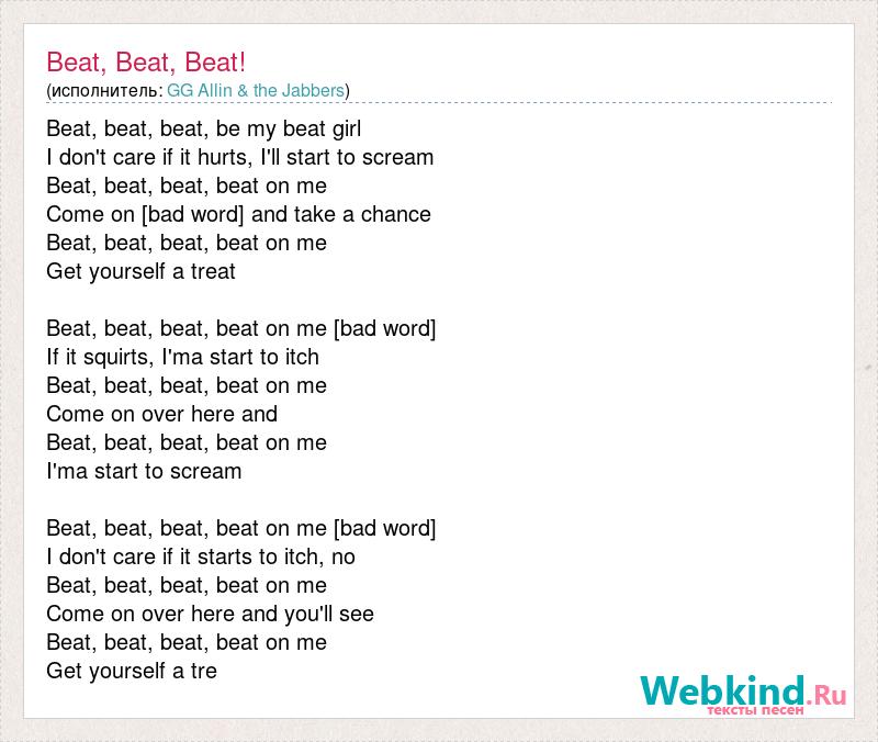 Beat, beat, beat, be my beat girl I don't care if it hurts, I'll start to scream Beat, beat, beat, beat on me Come on [bad word] and take a chance Beat, beat, beat, beat on me Get yourself a treat Beat, beat, beat, beat on me [bad word] If it squirts, I'ma start to itch Beat, beat, beat, beat on me Come on over here and Beat, beat, beat, beat on me I'ma start to scream Beat, beat, beat, beat on me [bad word] I don't care if it starts to itch, no Beat, beat, beat, beat on me Come on over here and you'll see Beat, beat, beat, beat on me Get yourself a tre