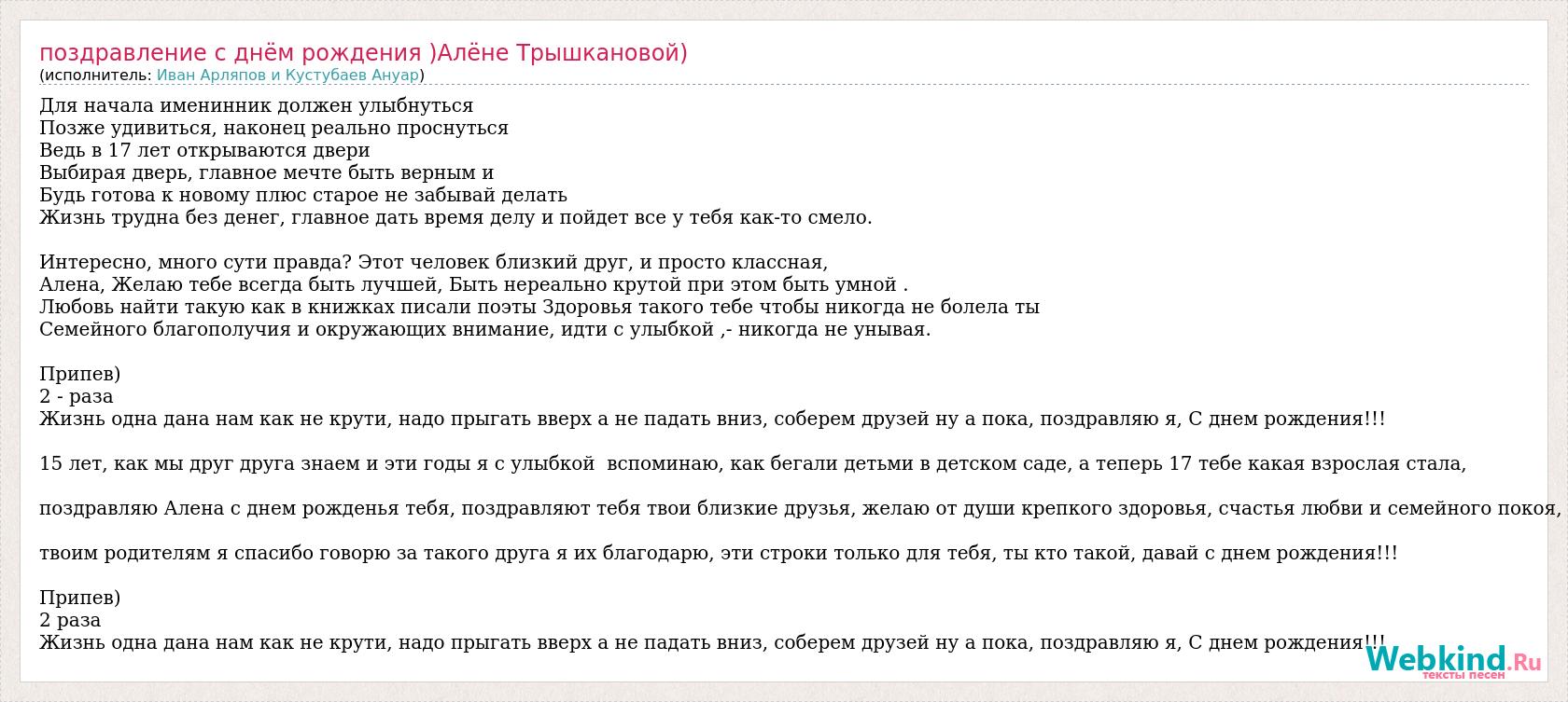 Для начала именинник должен улыбнуться Позже удивиться, наконец реально проснуться Ведь в 17 лет открываются двери Выбирая дверь, главное мечте быть верным и Будь готова к новому плюс старое не забывай делать Жизнь трудна без денег, главное дать время делу и пойдет все у тебя как-то смело. Интересно, много сути правда? Этот человек близкий друг, и просто классная, Алена, Желаю тебе всегда быть лучшей, Быть нереально крутой при этом быть умной . Любовь найти такую как в книжках писали поэты Здоровья такого тебе чтобы никогда не болела ты Семейного благополучия и окружающих внимание, идти с улыбкой ,- никогда не унывая. Припев) 2 - раза Жизнь одна дана нам как не крути, надо прыгать вверх а не падать вниз, соберем друзей ну а пока, поздравляю я, С днем рождения!!! 15 лет, как мы друг друга знаем и эти годы я с улыбкой вспоминаю, как бегали детьми в детском саде, а теперь 17 тебе какая взрослая стала, поздравляю Алена с днем рожденья тебя, поздравляют тебя твои близкие друзья, желаю от души крепкого здоровья, счастья любви и семейного покоя, твоим родителям я спасибо говорю за такого друга я их благодарю, эти строки только для тебя, ты кто такой, давай с днем рождения!!! Припев) 2 раза Жизнь одна дана нам как не крути, надо прыгать вверх а не падать вниз, соберем друзей ну а пока, поздравляю я, С днем рождения!!!