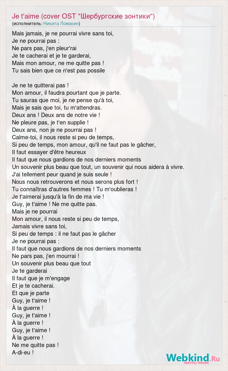 Mais jamais, je ne pourrai vivre sans toi, Je ne pourrai pas : Ne pars pas, j'en pleur'rai Je te cacherai et je te garderai, Mais mon amour, ne me quitte pas ! Tu sais bien que ce n'est pas possile Je ne te quitterai pas ! Mon amour, il faudra pourtant que je parte. Tu sauras que moi, je ne pense qu'à toi, Mais je sais que toi, tu m'attendras. Deux ans ! Deux ans de notre vie ! Ne pleure pas, je t'en supplie ! Deux ans, non je ne pourrai pas ! Calme-toi, il nous reste si peu de temps, Si peu de temps, mon amour, qu'il ne faut pas le gâcher, Il faut essayer d'être heureux Il faut que nous gardions de nos derniers moments Un souvenir plus beau que tout, un souvenir qui nous aidera à vivre. J'ai tellement peur quand je suis seule ! Nous nous retrouverons et nous serons plus fort ! Tu connaîtras d'autres femmes ! Tu m'oublieras ! Je t'aimerai jusqu'à la fin de ma vie ! Guy, je t'aime ! Ne me quitte pas. Mais je ne pourrai Mon amour, il nous reste si peu de temps, Jamais vivre sans toi, Si peu de temps : il ne faut pas le gâcher Je ne pourrai pas : Il faut que nous gardions de nos derniers moments Ne pars pas, j'en mourrai ! Un souvenir plus beau que tout Je te garderai Il faut que je m'engage Et je te cacherai. Et que je parte Guy, je t'aime ! À la guerre ! Guy, je t'aime ! À la guerre ! Guy, je t'aime ! À la guerre ! Ne me quitte pas ! A-di-eu !