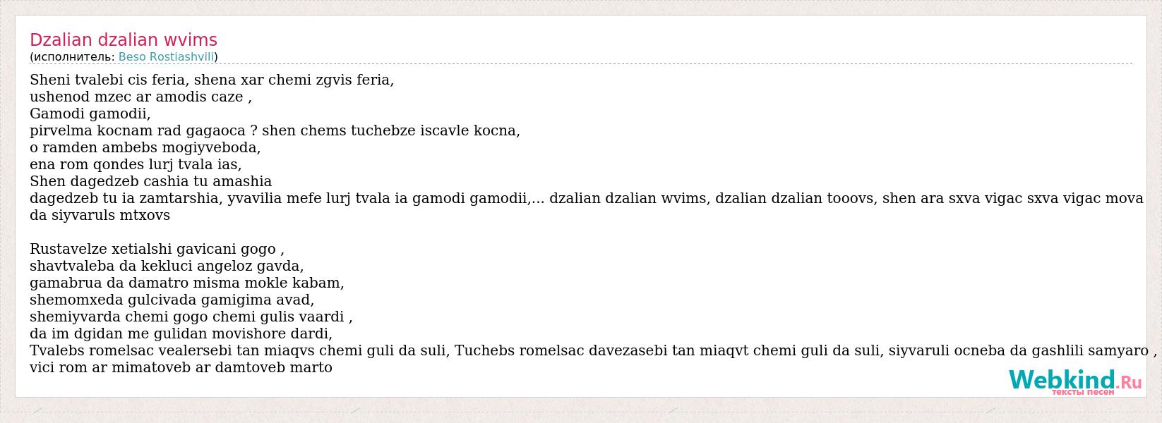 Sheni tvalebi cis feria, shena xar chemi zgvis feria, ushenod mzec ar amodis caze , Gamodi gamodii, pirvelma kocnam rad gagaoca ? shen chems tuchebze iscavle kocna, o ramden ambebs mogiyveboda, ena rom qondes lurj tvala ias, Shen dagedzeb cashia tu amashia dagedzeb tu ia zamtarshia, yvavilia mefe lurj tvala ia gamodi gamodii,... dzalian dzalian wvims, dzalian dzalian tooovs, shen ara sxva vigac sxva vigac mova da siyvaruls mtxovs Rustavelze xetialshi gavicani gogo , shavtvaleba da kekluci angeloz gavda, gamabrua da damatro misma mokle kabam, shemomxeda gulcivada gamigima avad, shemiyvarda chemi gogo chemi gulis vaardi , da im dgidan me gulidan movishore dardi, Tvalebs romelsac vealersebi tan miaqvs chemi guli da suli, Tuchebs romelsac davezasebi tan miaqvt chemi guli da suli, siyvaruli ocneba da gashlili samyaro , vici rom ar mimatoveb ar damtoveb marto