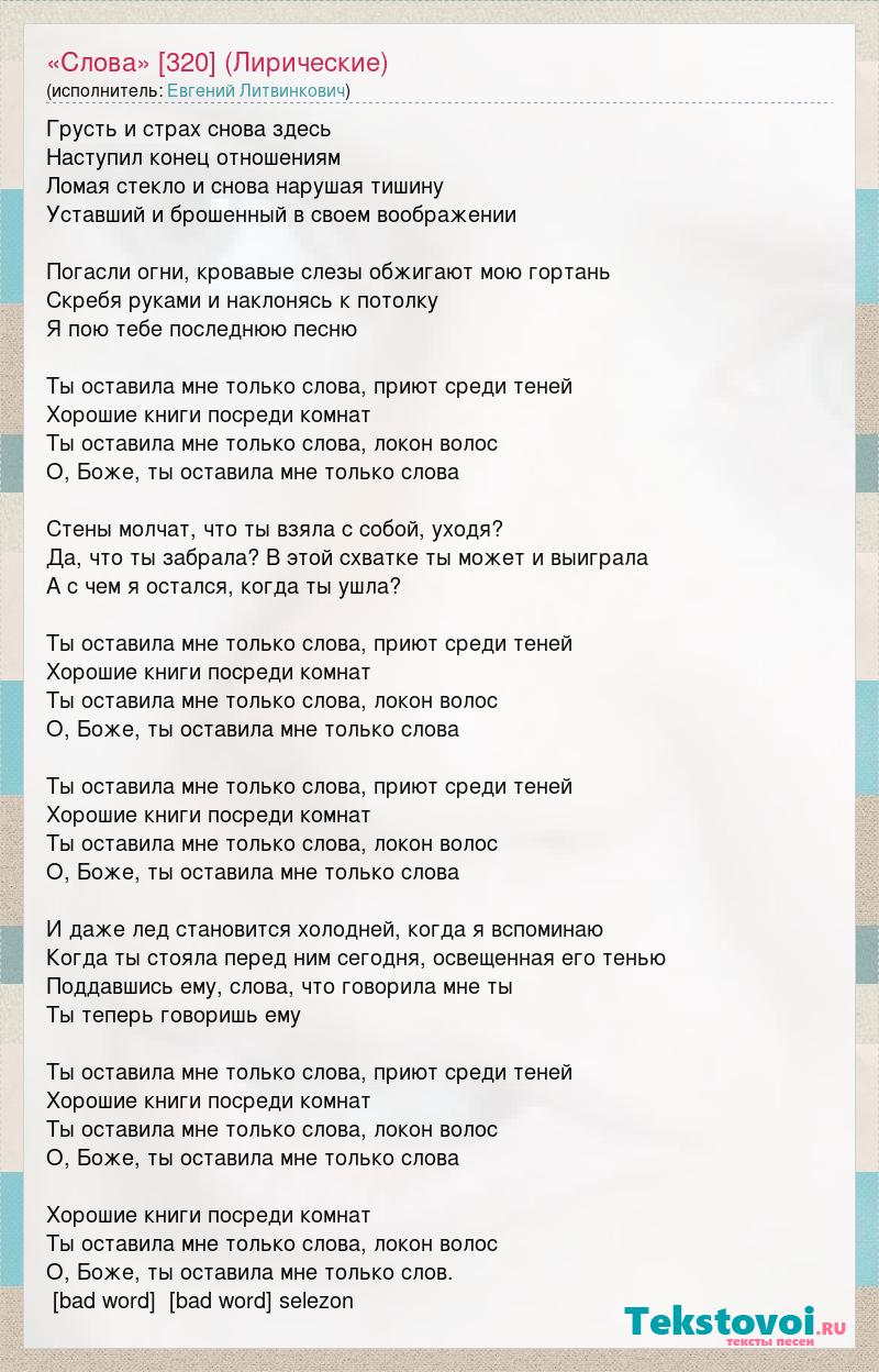 Грусть и страх снова здесь Наступил конец отношениям Ломая стекло и снова нарушая тишину Уставший и брошенный в своем воображении Погасли огни, кровавые слезы обжигают мою гортань Скребя руками и наклонясь к потолку Я пою тебе последнюю песню Ты оставила мне только слова, приют среди теней Хорошие книги посреди комнат Ты оставила мне только слова, локон волос О, Боже, ты оставила мне только слова Стены молчат, что ты взяла с собой, уходя? Да, что ты забрала? В этой схватке ты может и выиграла А с чем я остался, когда ты ушла? Ты оставила мне только слова, приют среди теней Хорошие книги посреди комнат Ты оставила мне только слова, локон волос О, Боже, ты оставила мне только слова Ты оставила мне только слова, приют среди теней Хорошие книги посреди комнат Ты оставила мне только слова, локон волос О, Боже, ты оставила мне только слова И даже лед становится холодней, когда я вспоминаю Когда ты стояла перед ним сегодня, освещенная его тенью Поддавшись ему, слова, что говорила мне ты Ты теперь говоришь ему Ты оставила мне только слова, приют среди теней Хорошие книги посреди комнат Ты оставила мне только слова, локон волос О, Боже, ты оставила мне только слова Хорошие книги посреди комнат Ты оставила мне только слова, локон волос О, Боже, ты оставила мне только слов. [bad word] [bad word] selezon
