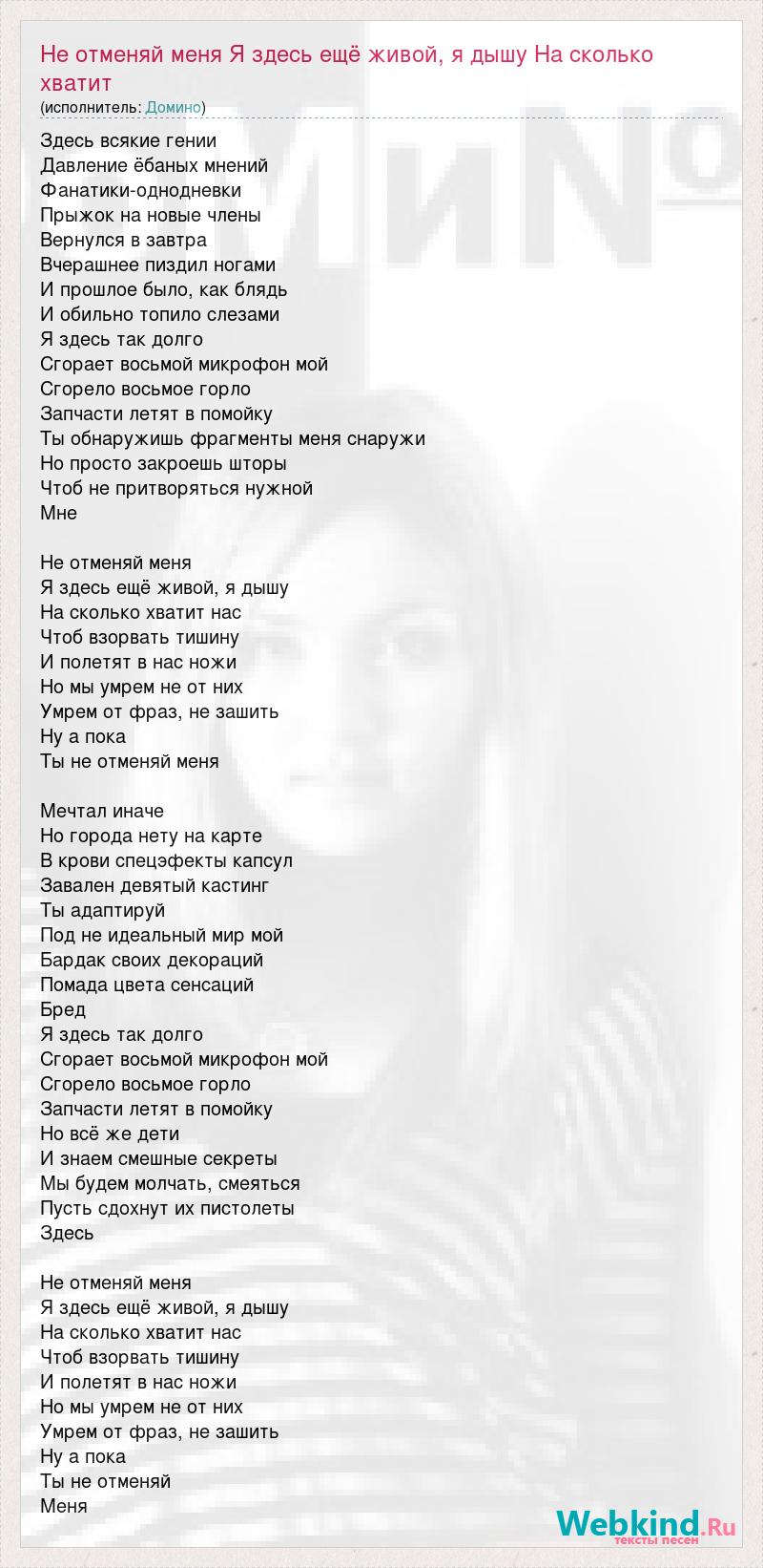 Главная→Исполнители→Домино→Не отменяй меня Я здесь ещё живой, я дышу На сколько хватит нас Чтоб взор
