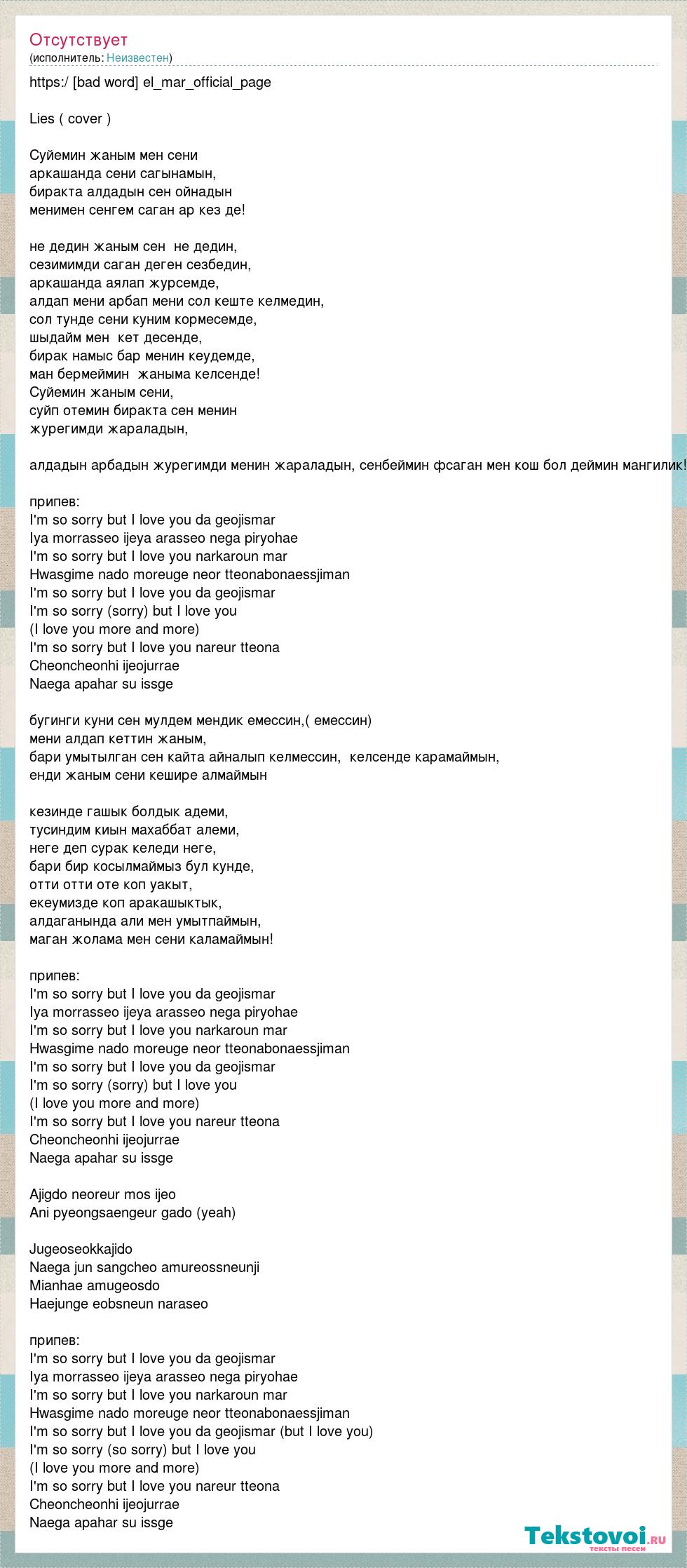 https:/ [bad word] el_mar_official_page Lies ( cover ) Суйемин жаным мен сени аркашанда сени сагынамын, биракта алдадын сен ойнадын менимен сенгем саган ар кез де! не дедин жаным сен не дедин, сезимимди саган деген сезбедин, аркашанда аялап журсемде, алдап мени арбап мени сол кеште келмедин, сол тунде сени куним кормесемде, шыдайм мен кет десенде, бирак намыс бар менин кеудемде, ман бермеймин жаныма келсенде! Суйемин жаным сени, суйп отемин биракта сен менин журегимди жараладын, алдадын арбадын журегимди менин жараладын, сенбеймин фсаган мен кош бол деймин мангилик! припев: I'm so sorry but I love you da geojismar Iya morrasseo ijeya arasseo nega piryohae I'm so sorry but I love you narkaroun mar Hwasgime nado moreuge neor tteonabonaessjiman I'm so sorry but I love you da geojismar I'm so sorry (sorry) but I love you (I love you more and more) I'm so sorry but I love you nareur tteona Cheoncheonhi ijeojurrae Naega apahar su issge бугинги куни сен мулдем мендик емессин,( емессин) мени алдап кеттин жаным, бари умытылган сен кайта айналып келмессин, келсенде карамаймын, енди жаным сени кешире алмаймын кезинде гашык болдык адеми, тусиндим киын махаббат алеми, неге деп сурак келеди неге, бари бир косылмаймыз бул кунде, отти отти оте коп уакыт, екеумизде коп аракашыктык, алдаганында али мен умытпаймын, маган жолама мен сени каламаймын! припев: I'm so sorry but I love you da geojismar Iya morrasseo ijeya arasseo nega piryohae I'm so sorry but I love you narkaroun mar Hwasgime nado moreuge neor tteonabonaessjiman I'm so sorry but I love you da geojismar I'm so sorry (sorry) but I love you (I love you more and more) I'm so sorry but I love you nareur tteona Cheoncheonhi ijeojurrae Naega apahar su issge Ajigdo neoreur mos ijeo Ani pyeongsaengeur gado (yeah) Jugeoseokkajido Naega jun sangcheo amureossneunji Mianhae amugeosdo Haejunge eobsneun naraseo припев: I'm so sorry but I love you da geojismar Iya morrasseo ijeya arasseo nega piryohae I'm so sorry but I love you narkaroun mar Hwasgime nado moreuge neor tteonabonaessjiman I'm so sorry but I love you da geojismar (but I love you) I'm so sorry (so sorry) but I love you (I love you more and more) I'm so sorry but I love you nareur tteona Cheoncheonhi ijeojurrae Naega apahar su issge