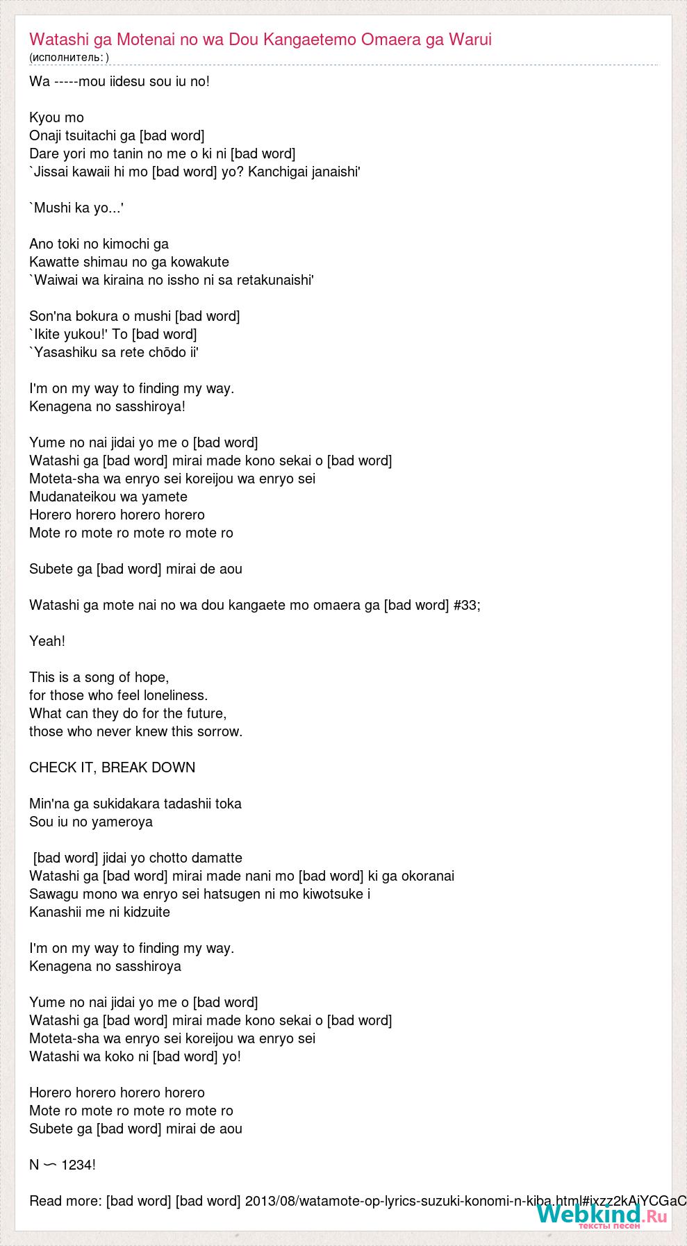 Wa -----mou iidesu sou iu no! Kyou mo Onaji tsuitachi ga [bad word] Dare yori mo tanin no me o ki ni [bad word] `Jissai kawaii hi mo [bad word] yo? Kanchigai janaishi' `Mushi ka yo...' Ano toki no kimochi ga Kawatte shimau no ga kowakute `Waiwai wa kiraina no issho ni sa retakunaishi' Son'na bokura o mushi [bad word] `Ikite yukou!' To [bad word] `Yasashiku sa rete chōdo ii' I'm on my way to finding my way. Kenagena no sasshiroya! Yume no nai jidai yo me o [bad word] Watashi ga [bad word] mirai made kono sekai o [bad word] Moteta-sha wa enryo sei koreijou wa enryo sei Mudanateikou wa yamete Horero horero horero horero Mote ro mote ro mote ro mote ro Subete ga [bad word] mirai de aou Watashi ga mote nai no wa dou kangaete mo omaera ga [bad word] #33; Yeah! This is a song of hope, for those who feel loneliness. What can they do for the future, those who never knew this sorrow. CHECK IT, BREAK DOWN Min'na ga sukidakara tadashii toka Sou iu no yameroya [bad word] jidai yo chotto damatte Watashi ga [bad word] mirai made nani mo [bad word] ki ga okoranai Sawagu mono wa enryo sei hatsugen ni mo kiwotsuke i Kanashii me ni kidzuite I'm on my way to finding my way. Kenagena no sasshiroya Yume no nai jidai yo me o [bad word] Watashi ga [bad word] mirai made kono sekai o [bad word] Moteta-sha wa enryo sei koreijou wa enryo sei Watashi wa koko ni [bad word] yo! Horero horero horero horero Mote ro mote ro mote ro mote ro Subete ga [bad word] mirai de aou N 〜 1234! Read more: [bad word] [bad word] 2013/08/watamote-op-lyrics-suzuki-konomi-n-kiba.html#ixzz2kAjYCGaC