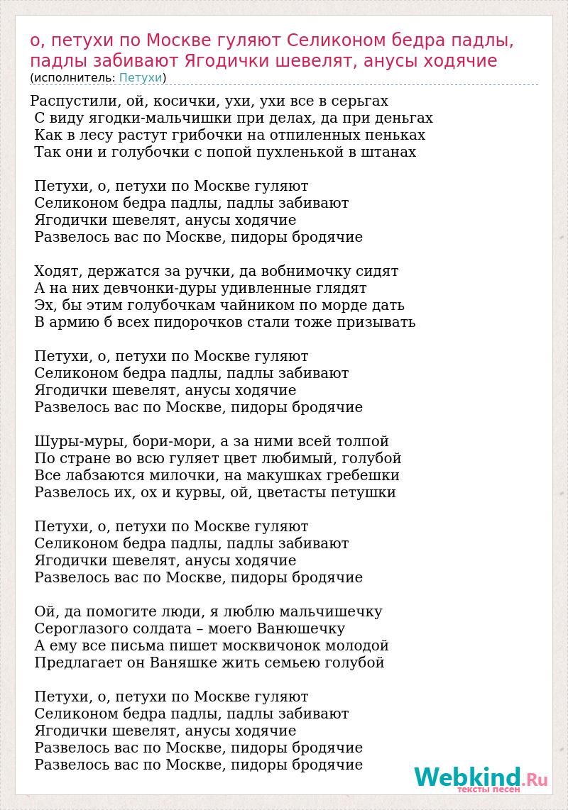 Распустили, ой, косички, ухи, ухи все в серьгах С виду ягодки-мальчишки при делах, да при деньгах Как в лесу растут грибочки на отпиленных пеньках Так они и голубочки с попой пухленькой в штанах Петухи, о, петухи по Москве гуляют Селиконом бедра падлы, падлы забивают Ягодички шевелят, анусы ходячие Развелось вас по Москве, пидоры бродячие Ходят, держатся за ручки, да вобнимочку сидят А на них девчонки-дуры удивленные глядят Эх, бы этим голубочкам чайником по морде дать В армию б всех пидорочков стали тоже призывать Петухи, о, петухи по Москве гуляют Селиконом бедра падлы, падлы забивают Ягодички шевелят, анусы ходячие Развелось вас по Москве, пидоры бродячие Шуры-муры, бори-мори, а за ними всей толпой По стране во всю гуляет цвет любимый, голубой Все лабзаются милочки, на макушках гребешки Развелось их, ох и курвы, ой, цветасты петушки Петухи, о, петухи по Москве гуляют Селиконом бедра падлы, падлы забивают Ягодички шевелят, анусы ходячие Развелось вас по Москве, пидоры бродячие Ой, да помогите люди, я люблю мальчишечку Сероглазого солдата – моего Ванюшечку А ему все письма пишет москвичонок молодой Предлагает он Ваняшке жить семьею голубой Петухи, о, петухи по Москве гуляют Селиконом бедра падлы, падлы забивают Ягодички шевелят, анусы ходячие Развелось вас по Москве, пидоры бродячие Развелось вас по Москве, пидоры бродячие