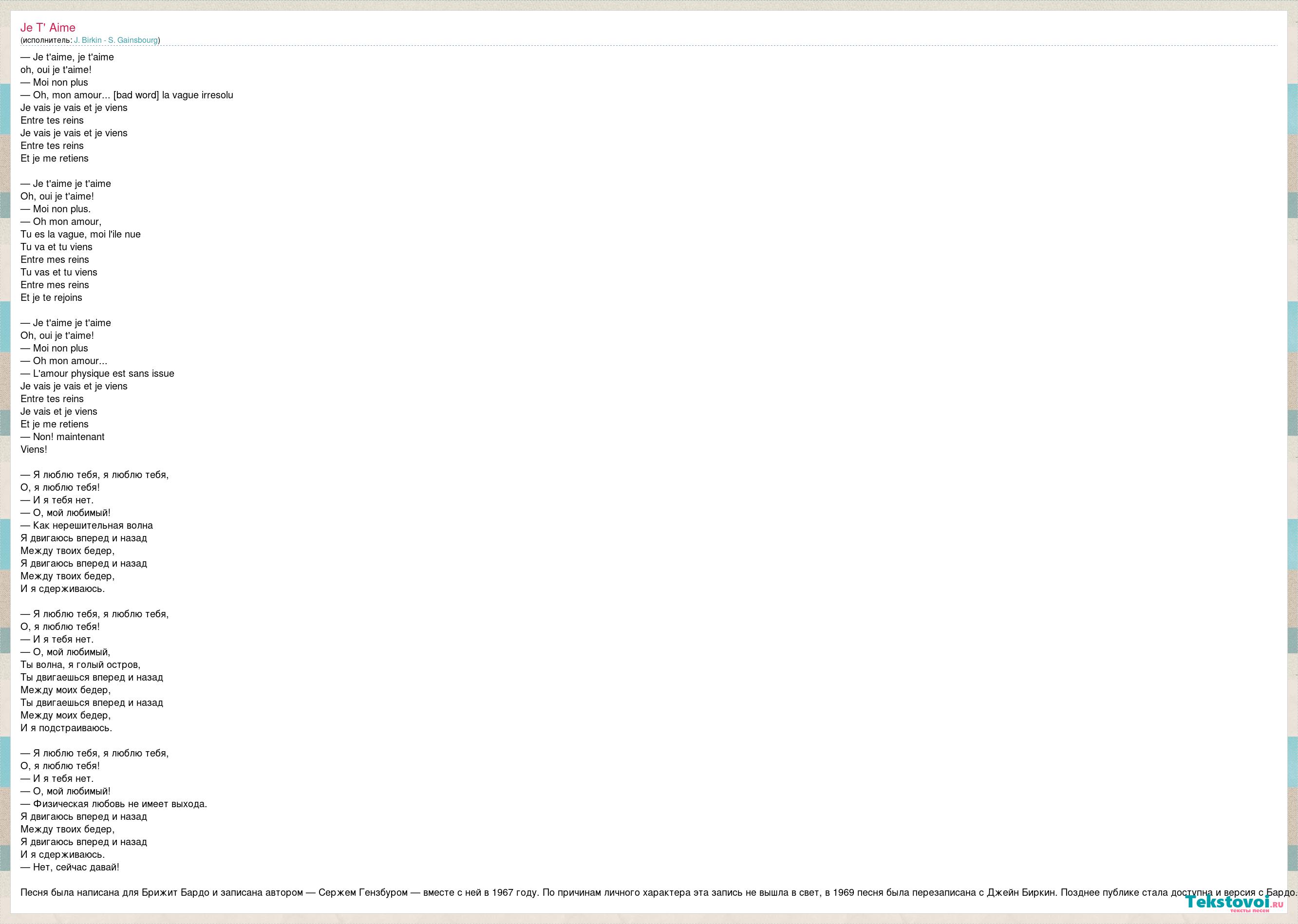 — Je t'aime, je t'aime oh, oui je t'aime! — Moi non plus — Oh, mon amour... — Comme la vague irresolu Je vais je vais et je viens Entre tes reins Je vais je vais et je viens Entre tes reins Et je me retiens — Je t'aime je t'aime Oh, oui je t'aime! — Moi non plus. — Oh mon amour, Tu es la vague, moi l'ile nue Tu va et tu viens Entre mes reins Tu vas et tu viens Entre mes reins Et je te rejoins — Je t'aime je t'aime Oh, oui je t'aime! — Moi non plus — Oh mon amour... — L'amour physique est sans issue Je vais je vais et je viens Entre tes reins Je vais et je viens Et je me retiens — Non! maintenant Viens! — Я люблю тебя, я люблю тебя, О, я люблю тебя! — И я тебя нет. — О, мой любимый! — Как нерешительная волна Я двигаюсь вперед и назад Между твоих бедер, Я двигаюсь вперед и назад Между твоих бедер, И я сдерживаюсь. — Я люблю тебя, я люблю тебя, О, я люблю тебя! — И я тебя нет. — О, мой любимый, Ты волна, я голый остров, Ты двигаешься вперед и назад Между моих бедер, Ты двигаешься вперед и назад Между моих бедер, И я подстраиваюсь. — Я люблю тебя, я люблю тебя, О, я люблю тебя! — И я тебя нет. — О, мой любимый! — Физическая любовь не имеет выхода. Я двигаюсь вперед и назад Между твоих бедер, Я двигаюсь вперед и назад И я сдерживаюсь. — Нет, сейчас давай! Песня была написана для Брижит Бардо и записана автором — Сержем Гензбуром — вместе с ней в 1967 году. По причинам личного характера эта запись не вышла в свет, в 1969 песня была перезаписана с Джейн Биркин. Позднее публике стала доступна и версия с Бардо.