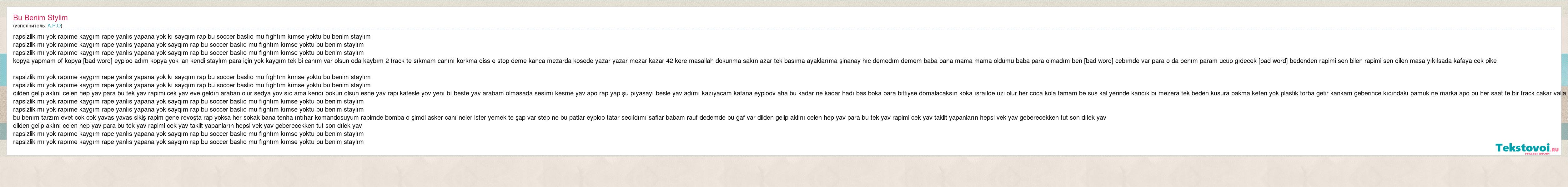 rapsizlik mı yok rapıme kaygım rape yanlıs yapana yok kı sayqım rap bu soccer baslıo mu fıghtım kımse yoktu bu benim staylım rapsizlik mı yok rapıme kaygım rape yanlıs yapana yok sayqım rap bu soccer baslıo mu fıghtım kımse yoktu bu benim staylım rapsizlik mı yok rapıme kaygım rape yanlıs yapana yok sayqım rap bu soccer baslıo mu fıghtım kımse yoktu bu benim staylım kopya yapmam of kopya [bad word] eypioo adım kopya yok lan kendi staylım para için yok kaygım tek bi canım var olsun oda kaybım 2 track te sıkmam canını korkma diss e stop deme kanca mezarda kosede yazar yazar mezar kazar 42 kere masallah dokunma sakın azar tek basıma ayaklarıma şinanay hıc demedım demem baba bana mama mama oldumu baba para olmadım ben [bad word] cebımde var para o da benım param ucup gıdecek bıqun ruh bedenden rapimi sen bilen rapimi sen dilen masa yıkılsada kafaya cek pike rapsizlik mı yok rapıme kaygım rape yanlıs yapana yok kı sayqım rap bu soccer baslıo mu fıghtım kımse yoktu bu benim staylım rapsizlik mı yok rapıme kaygım rape yanlıs yapana yok kı sayqım rap bu soccer baslıo mu fıghtım kımse yoktu bu benim staylım dilden gelip aklını celen hep yav para bu tek yav rapimi cek yav eve geldın araban olur sedya yov sıc ama kendı bokun olsun esne yav rapi kafesle yov yenı bı beste yav arabam olmasada sesımı kesme yav apo rap yap şu pıyasayı besle yav adımı kazıyacam kafana eypioov aha bu kadar ne kadar hadı bas boka para bittiyse domalacaksın koka ısraılde uzi olur her coca kola tamam be sus kal yerinde kancık bı mezera tek beden kusura bakma kefen yok plastik torba getir kankam geberince kıcındakı pamuk ne marka apo bu her saat te bir track cakar valla rapsizlik mı yok rapıme kaygım rape yanlıs yapana yok sayqım rap bu soccer baslıo mu fıghtım kımse yoktu bu benim staylım rapsizlik mı yok rapıme kaygım rape yanlıs yapana yok sayqım rap bu soccer baslıo mu fıghtım kımse yoktu bu benim staylım bu benım tarzım evet cok cok yavas yavas sikiş rapim gene revoşta rap yoksa her sokak bana tenha ıntıhar komandosuyum rapimde bomba o şimdi asker canı neler ister yemek te şap var step ne bu patlar eypioo tatar secıldımı saflar babam rauf dedemde bu gaf var dilden gelip aklını celen hep yav para bu tek yav rapimi cek yav taklit yapanların hepsi vek yav geberecekken tut son dılek yav dilden gelip aklını celen hep yav para bu tek yav rapimi cek yav taklit yapanların hepsi vek yav geberecekken tut son dılek yav rapsizlik mı yok rapıme kaygım rape yanlıs yapana yok sayqım rap bu soccer baslıo mu fıghtım kımse yoktu bu benim staylım rapsizlik mı yok rapıme kaygım rape yanlıs yapana yok sayqım rap bu soccer baslıo mu fıghtım kımse yoktu bu benim staylım