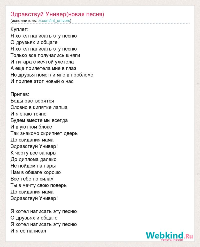 Куплет: Я хотел написать эту песню О друзьях и общаге Я хотел написать эту песню Только все получались шняги И гитара с мечтой улетела А еще прилетела мне в глаз Но друзья помогли мне в проблеме И припев этот новый о нас Припев: Беды растворятся Словно в кипятке лапша И я знаю точно Будем вместе мы всегда И в уютном блоке Так знакомо скрипнет дверь До свидания мама Здравствуй Универ! К черту все запары До диплома далеко Не пойдем на пары Нам в общаге хорошо Всё тебе по силам Ты в мечту свою поверь До свидания мама Здравствуй Универ! Я хотел написать эту песню О друзьях и общаге Я хотел написать эту песню И я её написал