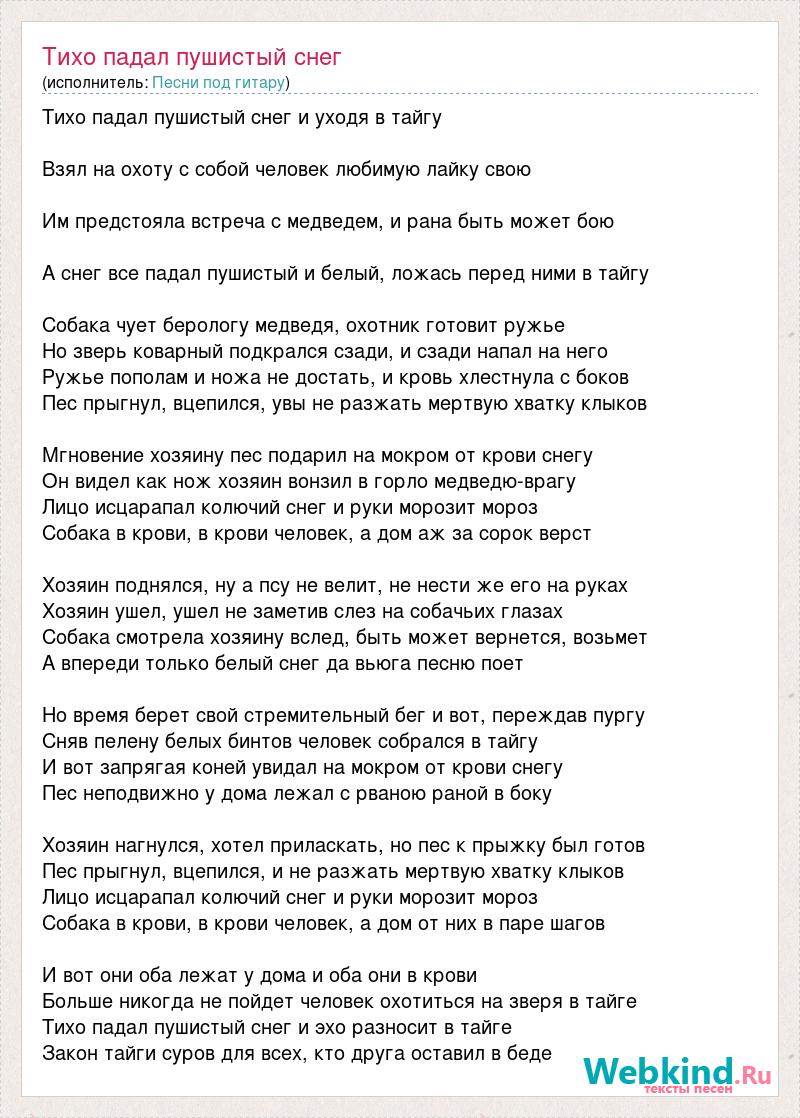 Тихо падал пушистый снег и уходя в тайгу Взял на охоту с собой человек любимую лайку свою Им предстояла встреча с медведем, и рана быть может бою А снег все падал пушистый и белый, ложась перед ними в тайгу Собака чует берологу медведя, охотник готовит ружье Но зверь коварный подкрался сзади, и сзади напал на него Ружье пополам и ножа не достать, и кровь хлестнула с боков Пес прыгнул, вцепился, увы не разжать мертвую хватку клыков Мгновение хозяину пес подарил на мокром от крови снегу Он видел как нож хозяин вонзил в горло медведю-врагу Лицо исцарапал колючий снег и руки морозит мороз Собака в крови, в крови человек, а дом аж за сорок верст Хозяин поднялся, ну а псу не велит, не нести же его на руках Хозяин ушел, ушел не заметив слез на собачьих глазах Собака смотрела хозяину вслед, быть может вернется, возьмет А впереди только белый снег да вьюга песню поет Но время берет свой стремительный бег и вот, переждав пургу Сняв пелену белых бинтов человек собрался в тайгу И вот запрягая коней увидал на мокром от крови снегу Пес неподвижно у дома лежал с рваною раной в боку Хозяин нагнулся, хотел приласкать, но пес к прыжку был готов Пес прыгнул, вцепился, и не разжать мертвую хватку клыков Лицо исцарапал колючий снег и руки морозит мороз Собака в крови, в крови человек, а дом от них в паре шагов И вот они оба лежат у дома и оба они в крови Больше никогда не пойдет человек охотиться на зверя в тайге Тихо падал пушистый снег и эхо разносит в тайге Закон тайги суров для всех, кто друга оставил в беде