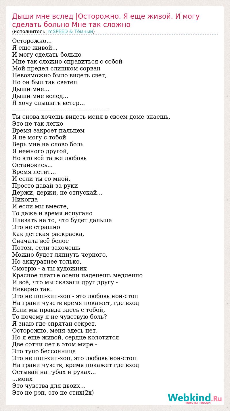 Осторожно... Я еще живой... И могу сделать больно Мне так сложно справиться с собой Мой предел слишком сорван Невозможно было видеть свет, Но он был так светел Дыши мне... Дыши мне вслед... Я хочу слышать ветер... -------------------------------------------------- Ты снова хочешь видеть меня в своем доме знаешь, Это не так легко Время закроет пальцем Я не могу с тобой Верь мне на слово боль Я немного другой, Но это всё та же любовь Остановись... Время летит... И если ты со мной, Просто давай за руки Держи, держи, не отпускай... Никогда И если мы вместе, То даже и время испугано Плевать на то, что будет дальше Это не страшно Как детская раскраска, Сначала всё белое Потом, если захочешь Можно будет ляпнуть черного, Но аккуратнее только, Смотрю - а ты художник Красное платье осени наденешь медленно И всё, что мы сказали друг другу - Неверно так. Это не поп-хип-хоп - это любовь нон-стоп На грани чувств время покажет, где вход Если мы правда здесь с тобой, То почему я не чувствую боль? Я знаю где спрятан секрет. Осторожно, меня здесь нет. Но я еще живой, сердце колотится Две сотни лет в этом мире - Это тупо бессонница Это не поп-хип-хоп, это любовь нон-стоп На грани чувств, время покажет где вход Остывай на губах и руках... ...моих Это чувства для двоих... Это не рэп, это не стих(2х)