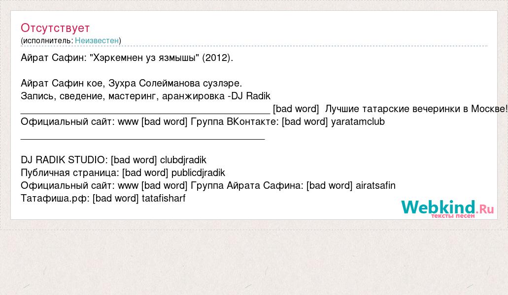 Айрат Сафин: "Хэркемнен уз язмышы" (2012). Айрат Сафин кое, Зухра Солейманова сузлэре. Запись, сведение, мастеринг, аранжировка -DJ Radik ______________________________________________ [bad word] Лучшие татарские вечеринки в Москве! Официальный сайт: www [bad word] Группа ВКонтакте: [bad word] yaratamclub _____________________________________________ DJ RADIK STUDIO: [bad word] clubdjradik Публичная страница: [bad word] publicdjradik Официальный сайт: www [bad word] Группа Айрата Сафина: [bad word] airatsafin Татафиша.рф: [bad word] tatafisharf