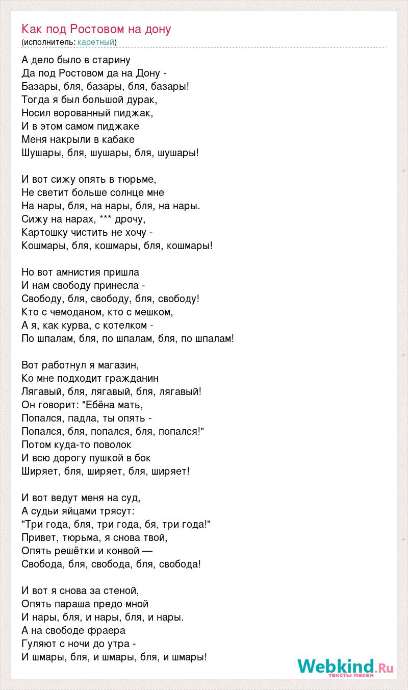 А дело было в старину Да под Ростовом да на Дону - Базары, бля, базары, бля, базары! Тогда я был большой дурак, Носил ворованный пиджак, И в этом самом пиджаке Меня накрыли в кабаке Шушары, бля, шушары, бля, шушары! И вот сижу опять в тюрьме, Не светит больше солнце мне На нары, бля, на нары, бля, на нары. Сижу на нарах, *** дрочу, Картошку чистить не хочу - Кошмары, бля, кошмары, бля, кошмары! Но вот амнистия пришла И нам свободу принесла - Свободу, бля, свободу, бля, свободу! Кто с чемоданом, кто с мешком, А я, как курва, с котелком - По шпалам, бля, по шпалам, бля, по шпалам! Вот работнул я магазин, Ко мне подходит гражданин Лягавый, бля, лягавый, бля, лягавый! Он говорит: "Ебёна мать, Попался, падла, ты опять - Попался, бля, попался, бля, попался!" Потом куда-то поволок И всю дорогу пушкой в бок Ширяет, бля, ширяет, бля, ширяет! И вот ведут меня на суд, А судьи яйцами трясут: "Три года, бля, три года, бя, три года!" Привет, тюрьма, я снова твой, Опять решётки и конвой — Свобода, бля, свобода, бля, свобода! И вот я снова за стеной, Опять параша предо мной И нары, бля, и нары, бля, и нары. А на свободе фраера Гуляют с ночи до утра - И шмары, бля, и шмары, бля, и шмары!