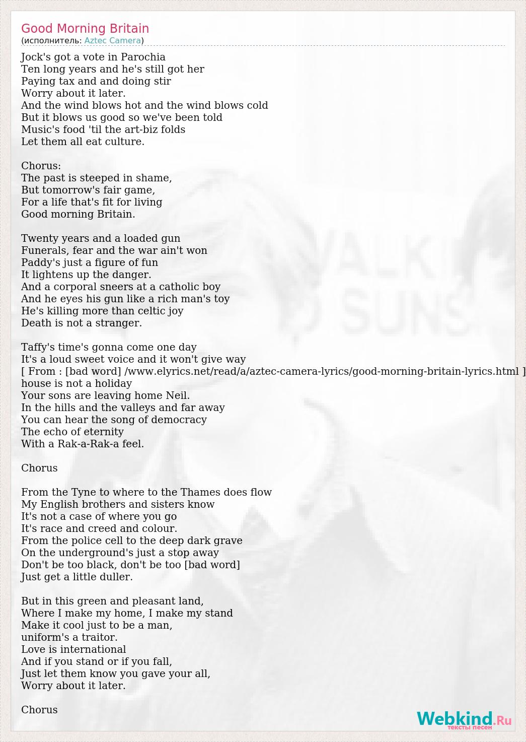 Jock's got a vote in Parochia Ten long years and he's still got her Paying tax and and doing stir Worry about it later. And the wind blows hot and the wind blows cold But it blows us good so we've been told Music's food 'til the art-biz folds Let them all eat culture. Chorus: The past is steeped in shame, But tomorrow's fair game, For a life that's fit for living Good morning Britain. Twenty years and a loaded gun Funerals, fear and the war ain't won Paddy's just a figure of fun It lightens up the danger. And a corporal sneers at a catholic boy And he eyes his gun like a rich man's toy He's killing more than celtic joy Death is not a stranger. Taffy's time's gonna come one day It's a loud sweet voice and it won't give way [ From : [bad word] /www.elyrics.net/read/a/aztec-camera-lyrics/good-morning-britain-lyrics.html ] house is not a holiday Your sons are leaving home Neil. In the hills and the valleys and far away You can hear the song of democracy The echo of eternity With a Rak-a-Rak-a feel. Chorus From the Tyne to where to the Thames does flow My English brothers and sisters know It's not a case of where you go It's race and creed and colour. From the police cell to the deep dark grave On the underground's just a stop away Don't be too black, don't be too [bad word] Just get a little duller. But in this green and pleasant land, Where I make my home, I make my stand Make it cool just to be a man, uniform's a traitor. Love is international And if you stand or if you fall, Just let them know you gave your all, Worry about it later. Chorus