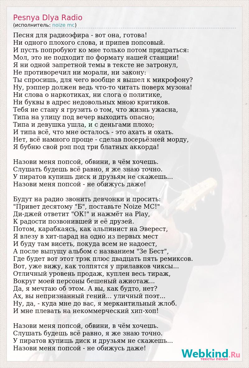 Песня для радиоэфира - вот она, готова! Ни одного плохого слова, и припев попсовый. И пусть попробуют ко мне только потом придраться: Мол, это не подходит по формату нашей станции! Я ни одной запретной темы в тексте не затронул, Не противоречил ни морали, ни закону: Ты спросишь, для чего вообще я вышел к микрофону? Ну, рэппер должен ведь что-то читать поверх музона! Ни слова о наркотиках, ни слога о политике, Ни буквы в адрес недовольных мною критиков. Тебя не стану я грузить о том, что жизнь ужасна, Типа на улицу под вечер выходить опасно; Типа и девушка ушла, и с деньгами плохо; И типа всё, что мне осталось - это ахать и охать. Нет, всё намного проще - сделав посерьёзней морду, Я бубню свой рэп под три блатных аккорда! Назови меня попсой, обвини, в чём хочешь. Слушать будешь всё равно, я же знаю точно. У пиратов купишь диск и друзьям не скажешь... Назови меня попсой - не обижусь даже! Будут на радио звонить девчонки и просить: "Привет десятому "Б", поставьте Noize MC!" Ди-джей ответит "ОК!" и нажмёт на Play, К радости позвонившей и её друзей. Потом, карабкаясь, как альпинист на Эверест, Я влезу в хит-парад на одно из первых мест И буду там висеть, покуда всем не надоест, А после выпущу альбом с названием "Зе Бест", Где будет вот этот трэк плюс двадцать пять ремиксов. Вот, уже вижу, как толпятся у прилавков чиксы... Отличный уровень продаж, куплен весь тираж, Вокруг моей персоны бешеный ажиотаж... Да, я мечтаю об этом. А вы, как будто, нет? Ах, вы непризнанный гений... уличный поэт... Ну, да, - куда мне до вас, я меркантильный жлоб. И мне плевать на некоммерческий хип-хоп! Назови меня попсой, обвини, в чём хочешь. Слушать будешь всё равно, я же знаю точно. У пиратов купишь диск и друзьям не скажешь... Назови меня попсой - не обижусь даже!