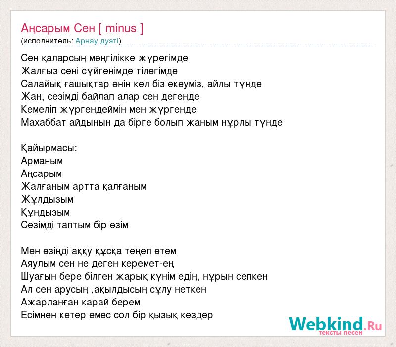 Сен қаларсың мәңгілікке жүрегімде Жалғыз сені сүйгенімде тілегімде Салайық ғашықтар әнін кел біз екеуміз, айлы түнде Жан, сезімді байлап алар сен дегенде Кемеліп жүргендеймін мен жүргенде Махаббат айдынын да бірге болып жаным нұрлы түнде Қайырмасы: Арманым Аңсарым Жалғаным артта қалғаным Жұлдызым Құндызым Сезімді таптым бір өзім Мен өзіңді аққу құсқа теңеп өтем Аяулым сен не деген керемет-ең Шуағын бере білген жарық күнім едің, нұрын сепкен Ал сен арусың ,ақылдысың сұлу неткен Ажарланған карай берем Есімнен кетер емес сол бір қызық кездер