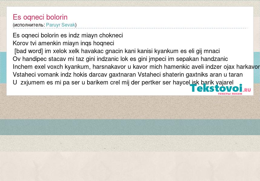 Es oqneci bolorin es indz miayn chokneci Korov tvi amenkin miayn inqs hoqneci [bad word] im xelok xelk havakac gnacin kani kanisi kyankum es eli gij mnaci Ov handipec stacav mi taz gini indzanic lok es gini jmpeci im sepakan handzanic Inchem exel voxch kyankum, harsnakavor u kavor mich hamenkic aveli indzer ojax harkavor Vstaheci vomank indz hokis darcav gaxtnaran Vstaheci shaterin gaxtniks aran u taran U zxjumem es mi pa ser u barikem crel mij der pertker ser haycel isk barik vajarel